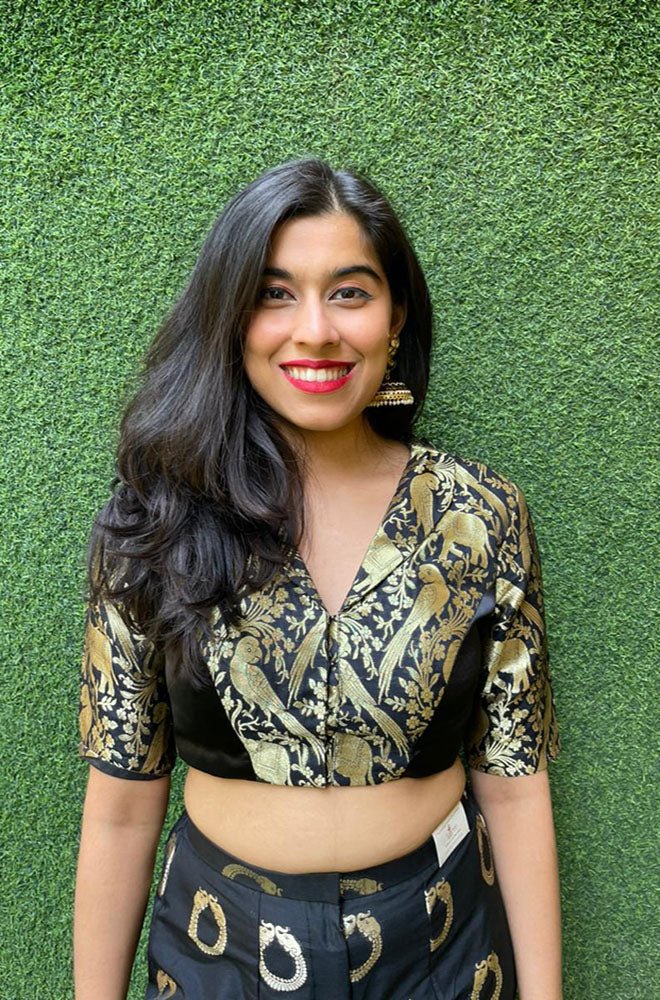The Black Banarasi Silk 3/4 Sleeves Collar Neck Padded Parrot and Elephant Design Blouse is a masterpiece of traditional craftsmanship and contemporary design. Crafted from exquisite Banarasi silk, it exudes opulence and showcases intricate parrot and elephant motifs in its design. The 3/4 sleeves and collar neck add a touch of regal elegance, making it suitable for various occasions. The blouse features padding for comfort and a flattering fit, ensuring a seamless fusion of style and comfort. The combination of classic black and the ornate animal motifs creates a unique and captivating piece that complements sarees beautifully, making it ideal for special events.