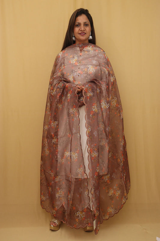 Brown Digital Printed Organza Silk Dupatta With Scalloped Border