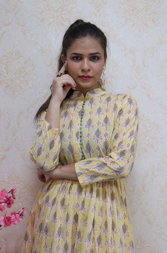Yellow Cotton Block Printed Pleated Top With Straight Pant