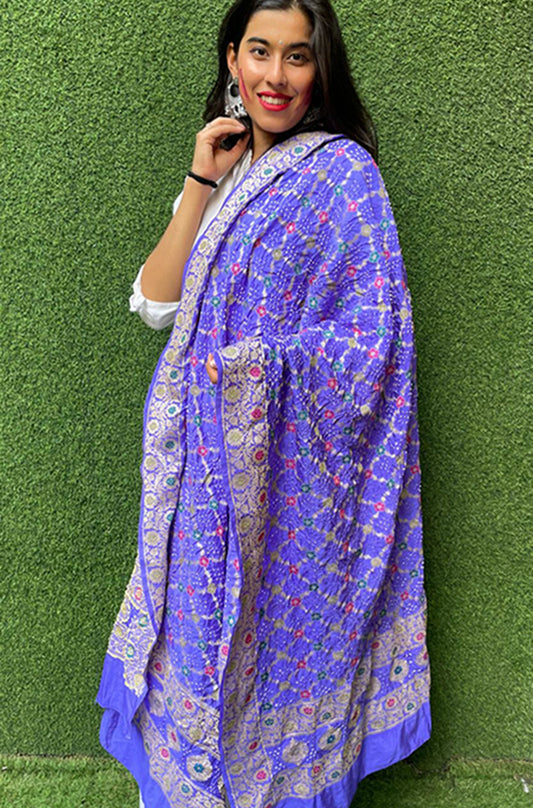 Blue Checks Bandhani Silk Meenakari Dupatta