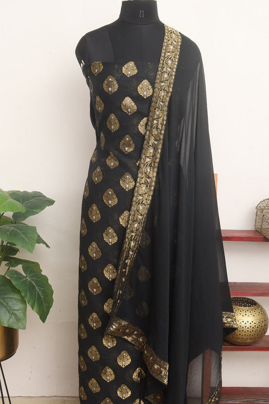 Stunning Black Banarasi Georgette Sona Roopa Suit Set - Unstitched