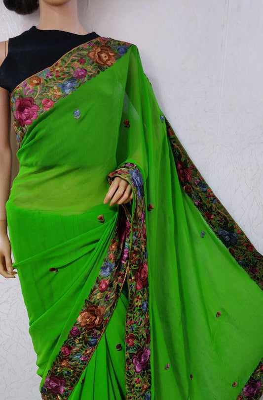Green Hand Embroidered Pure Georgette Parsi Gara Saree