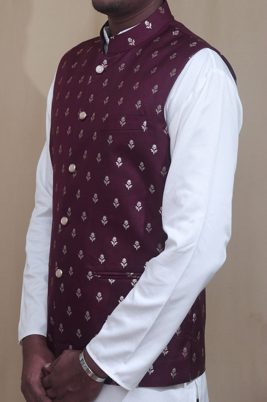 Maroon Handloom Banarasi Pure Katan Silk Nehru Jacket