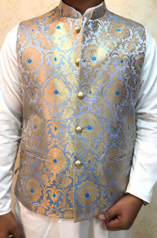 Blue Handloom Banarasi Kimkhwab Nehru Jacket