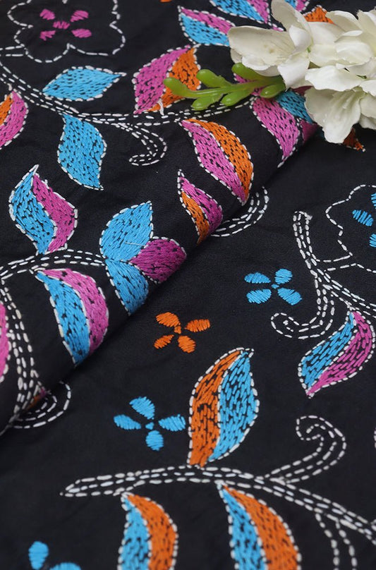 Black Hand Embroidered Kantha Silk Fabric ( 1 Mtr )
