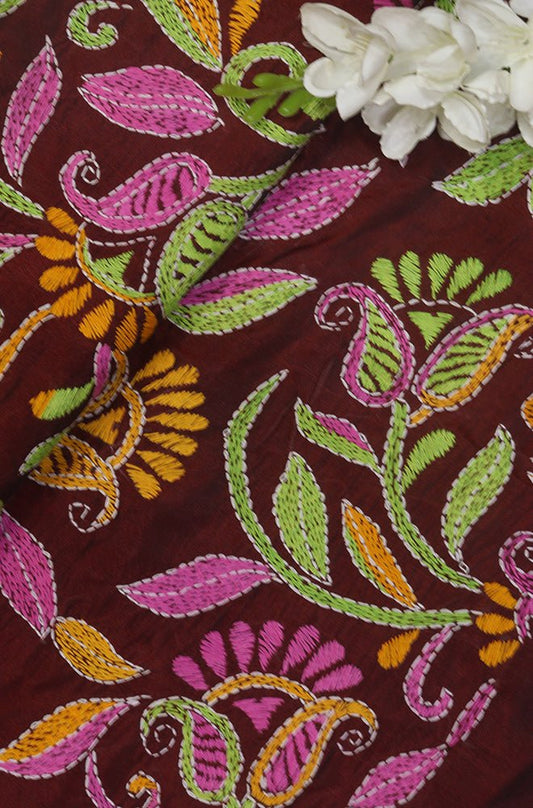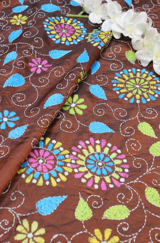 Brown Hand Embroidered Kantha Silk Fabric ( 1 Mtr )