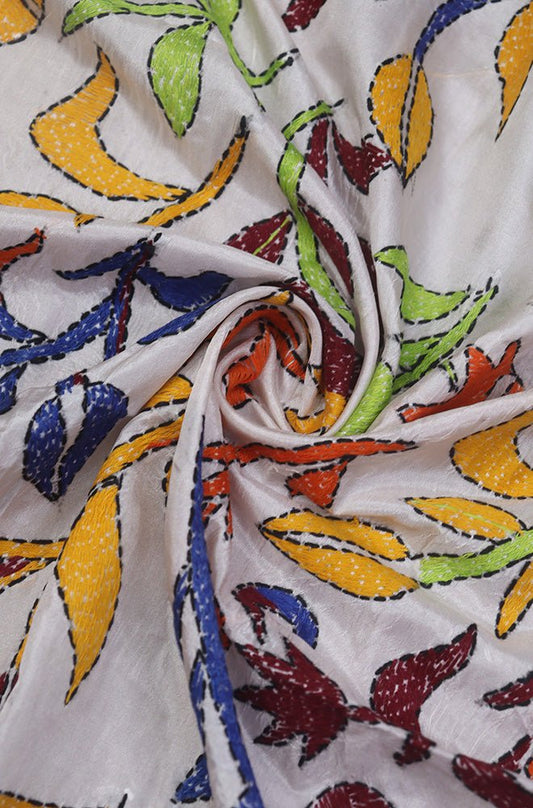 Off White Hand Embroidered Kantha Silk Fabric ( 1 Mtr )