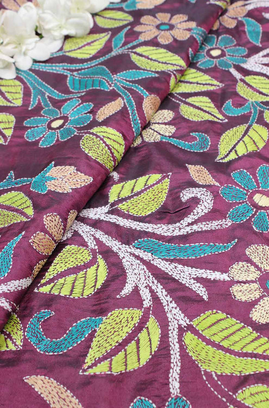 Maroon Hand Embroidered Kantha Silk Fabric ( 1 Mtr )