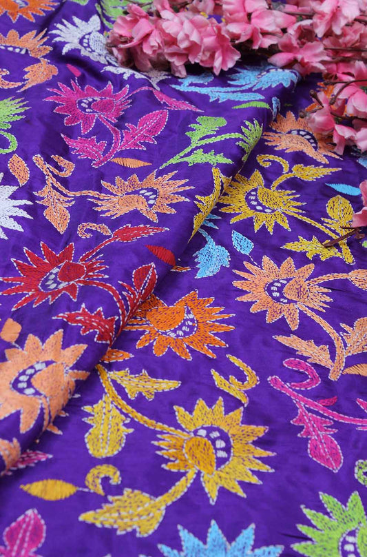 Purple Hand Embroidered Kantha Silk Fabric ( 1 Mtr )