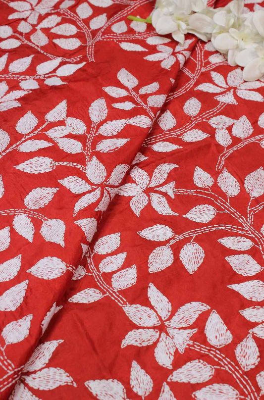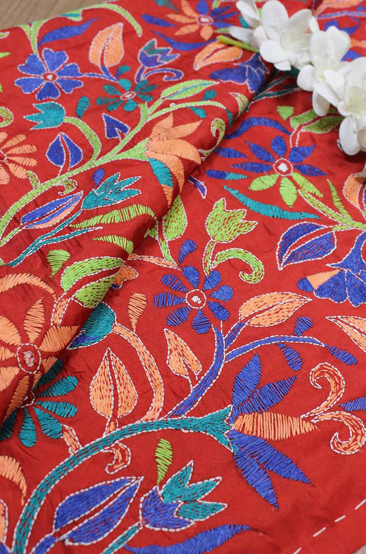 Red Hand Embroidered Kantha Silk Fabric ( 1 Mtr )