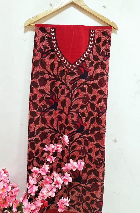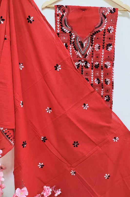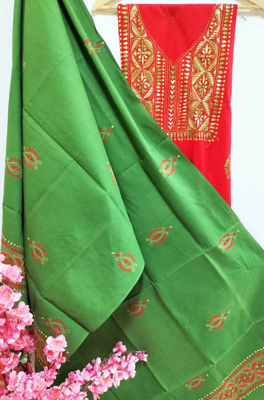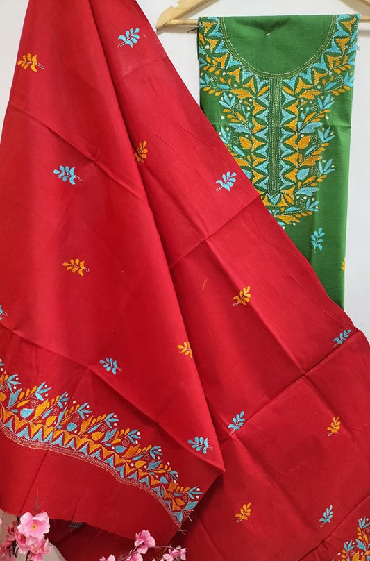 Red Hand Embroidered Kantha Pure Cotton Three Piece Unstitched Suit Set