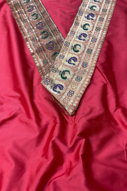 Blue Pink Plain Soft Silk Unstitched Kurti Fabric With Vintage Banarasi Border