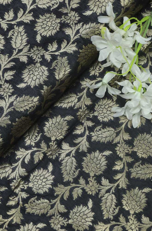 Elegant Black Banarasi Silk Silver Zari Floral Design Fabric ( 1 Mtr )