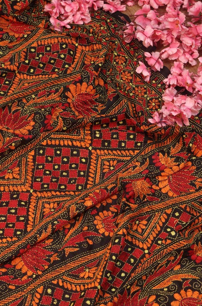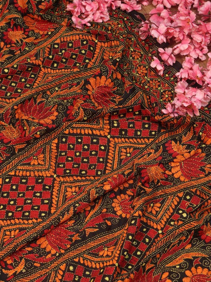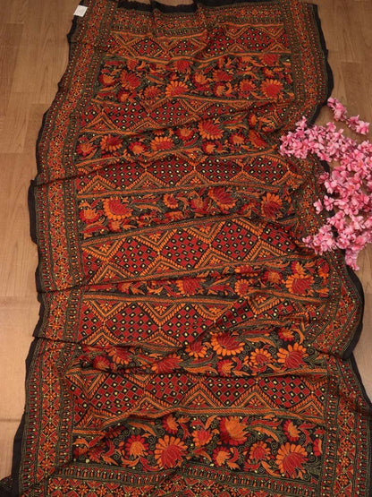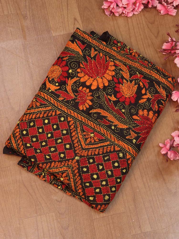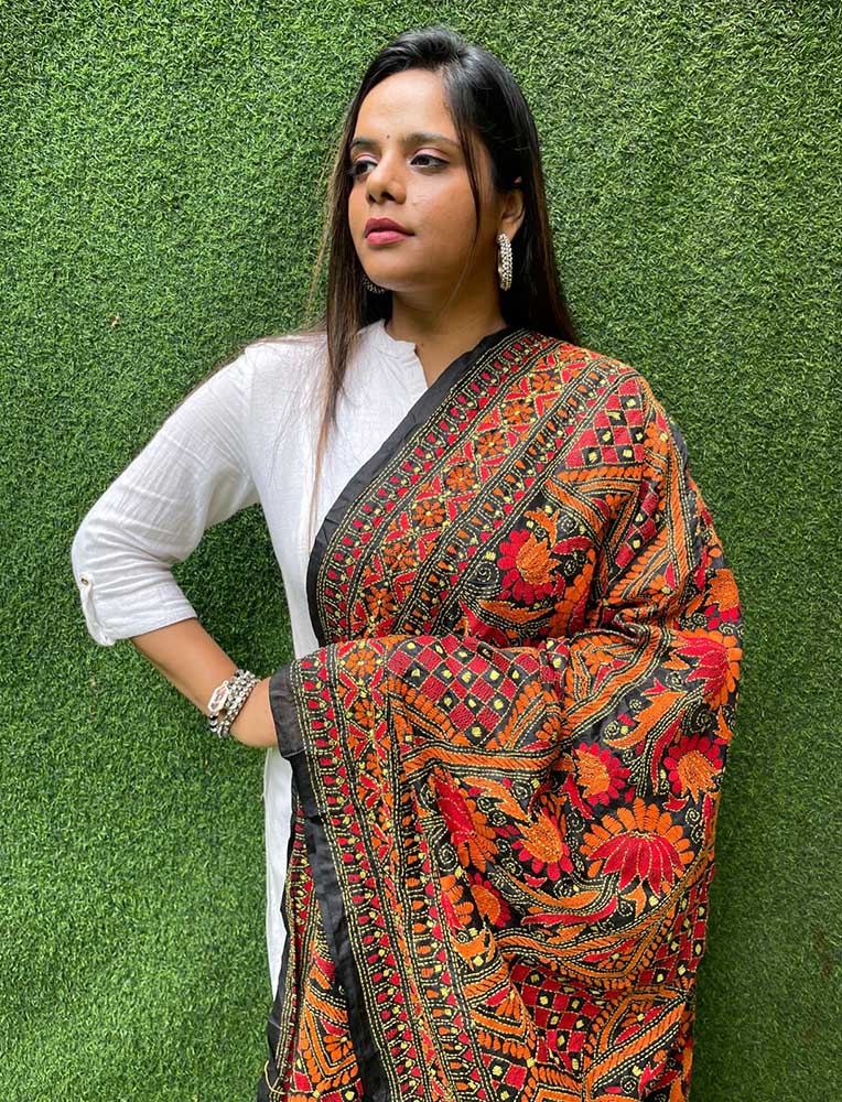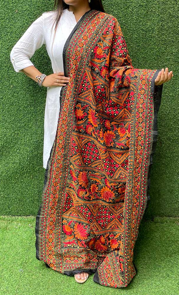 Black Hand Embroidered Kantha Bangalore Silk Dupatta