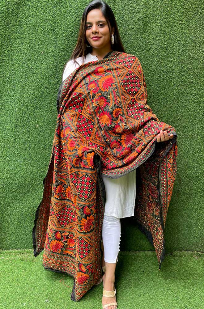 The Kantha Dupatta is a manifestation of creativity beyond imagination. Its an exclusive dupatta Hand Embroidered and a fresh collection directly from weavers in Bengal. The interesting thing in this embroidery is the entire cloth is covered with running stitches, and playing beautiful motifs, of flowers animals and birds. And geometrical shapes, as well as themes from everyday activities. The stitching on the cloth gives it a slight wrinkled wavy effect.