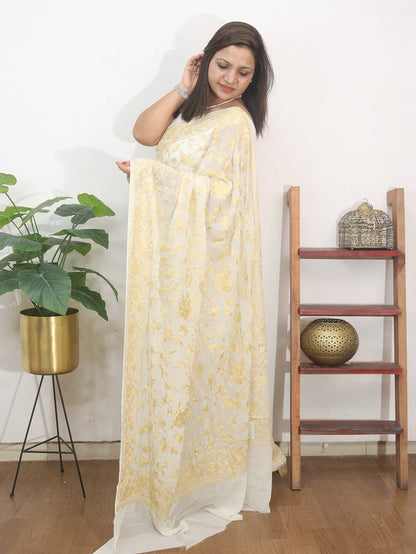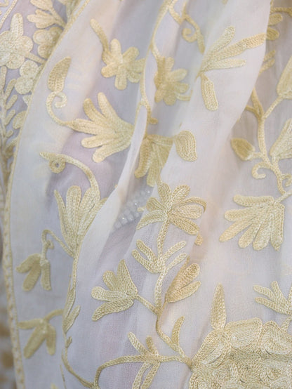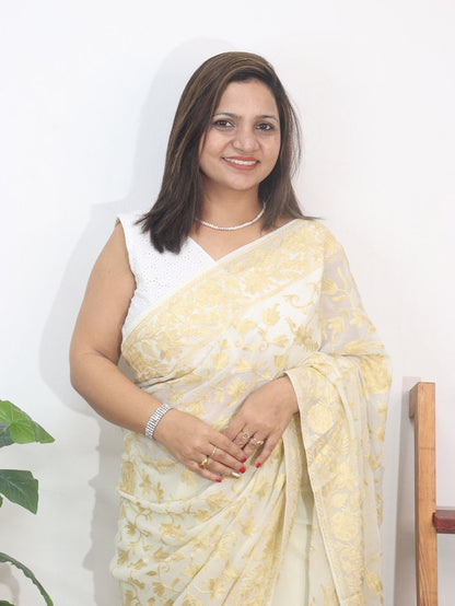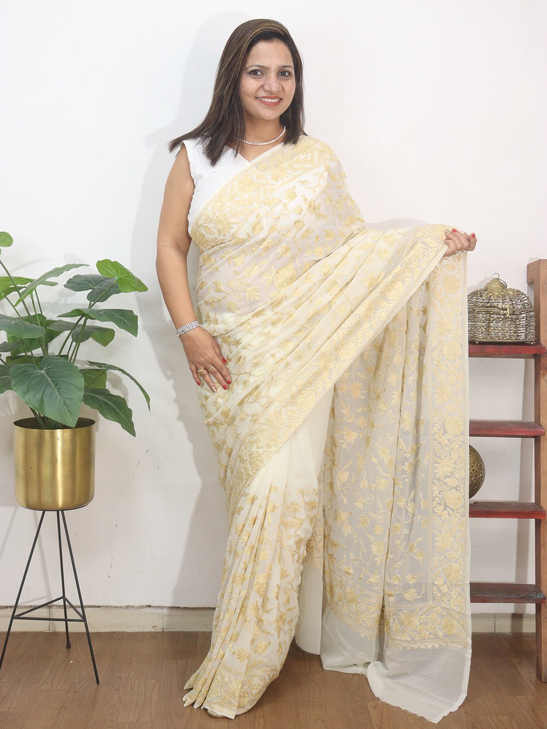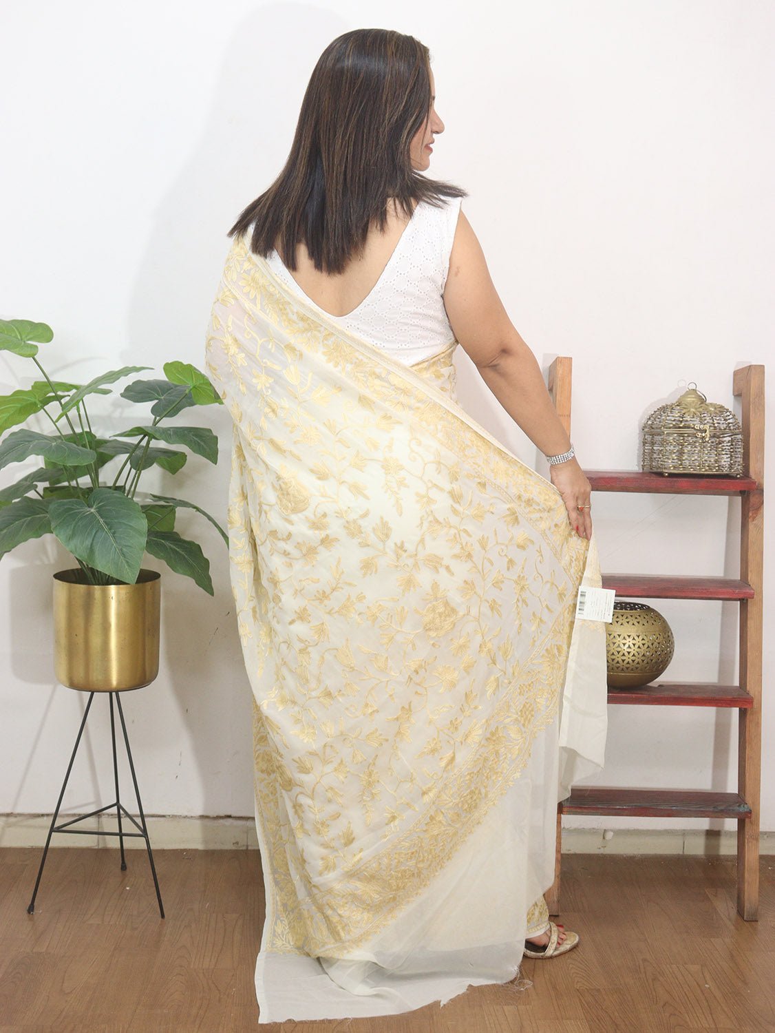 Off White Embroidered Kashmiri Aari Work Georgette Saree