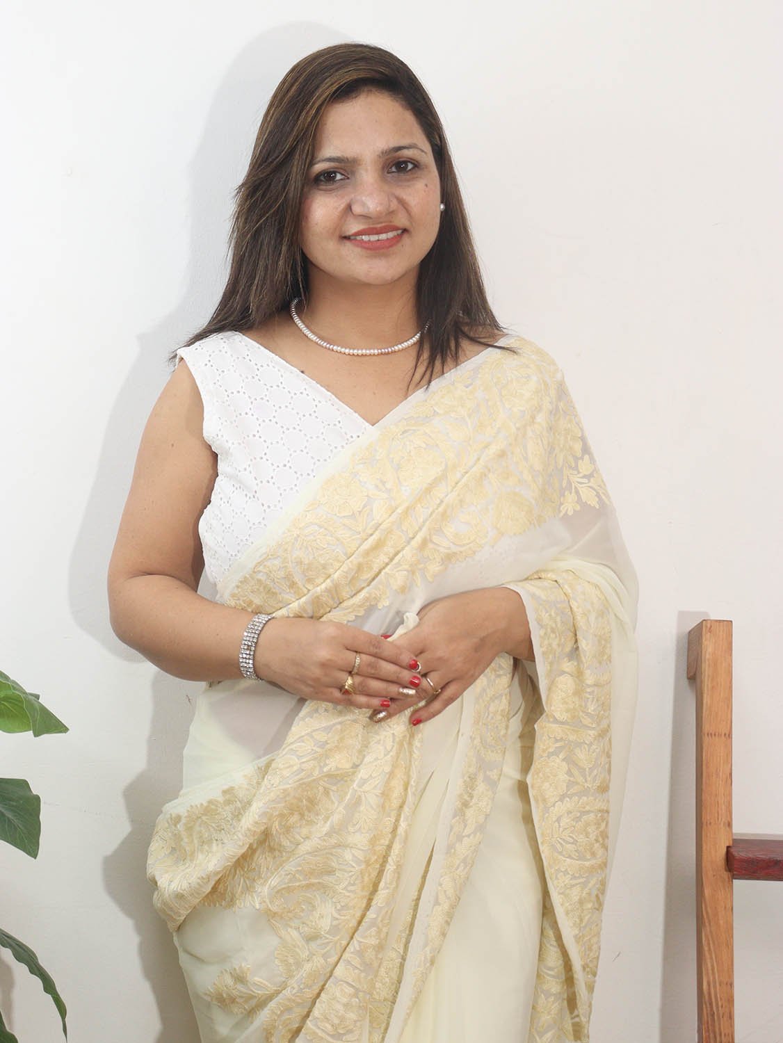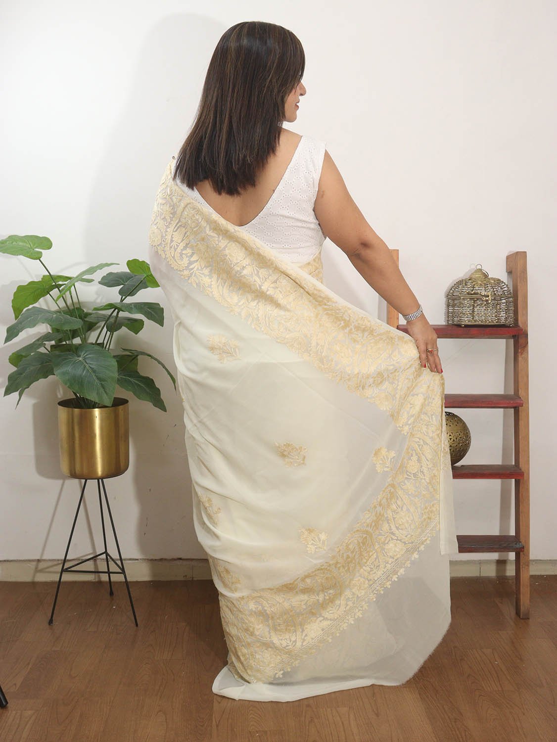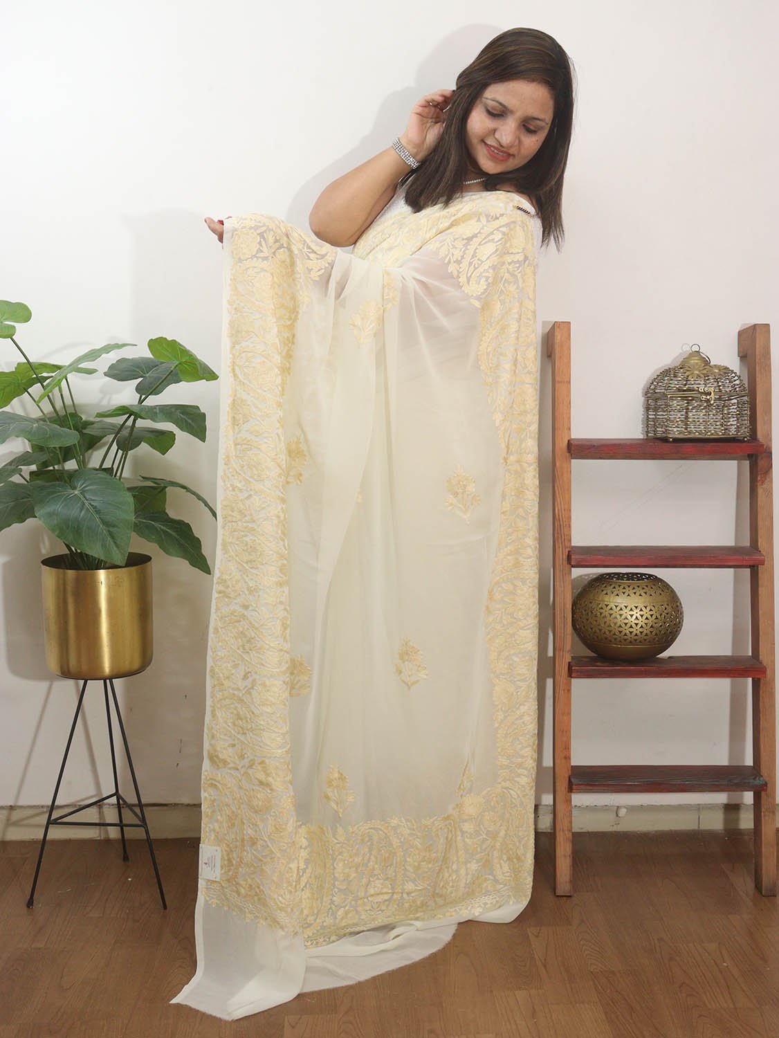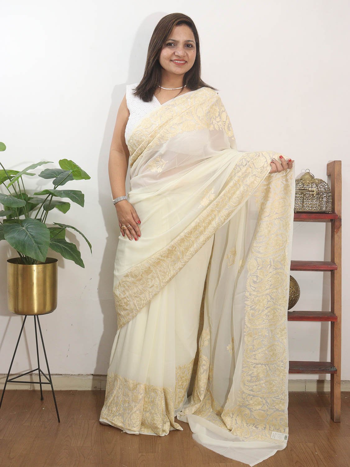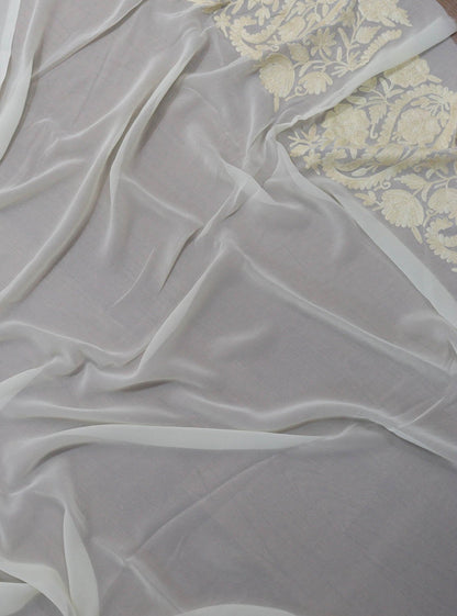 Off White Embroidered Kashmiri Aari Work Georgette Saree