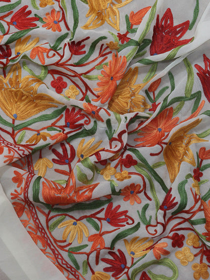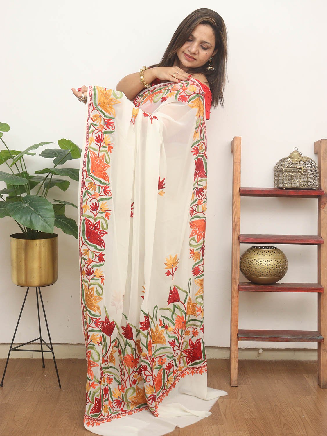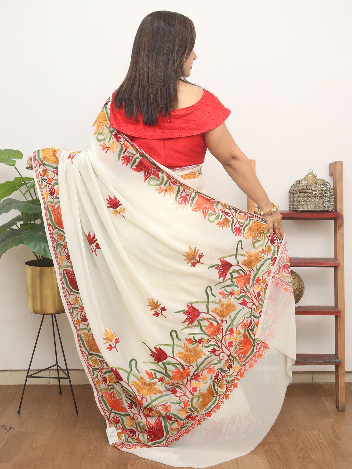 Off White Embroidered Kashmiri Aari Work Georgette Saree