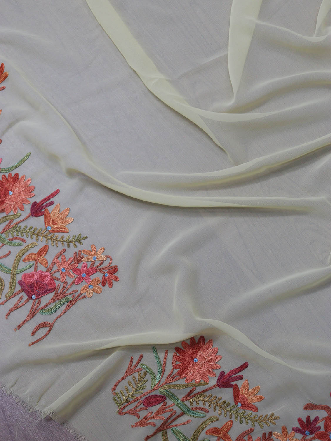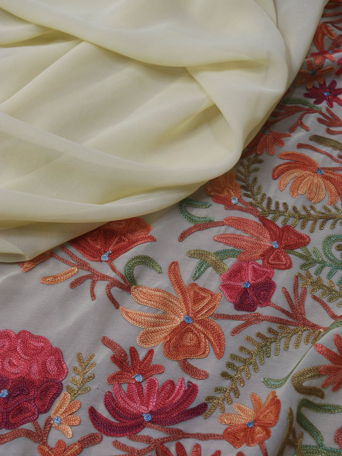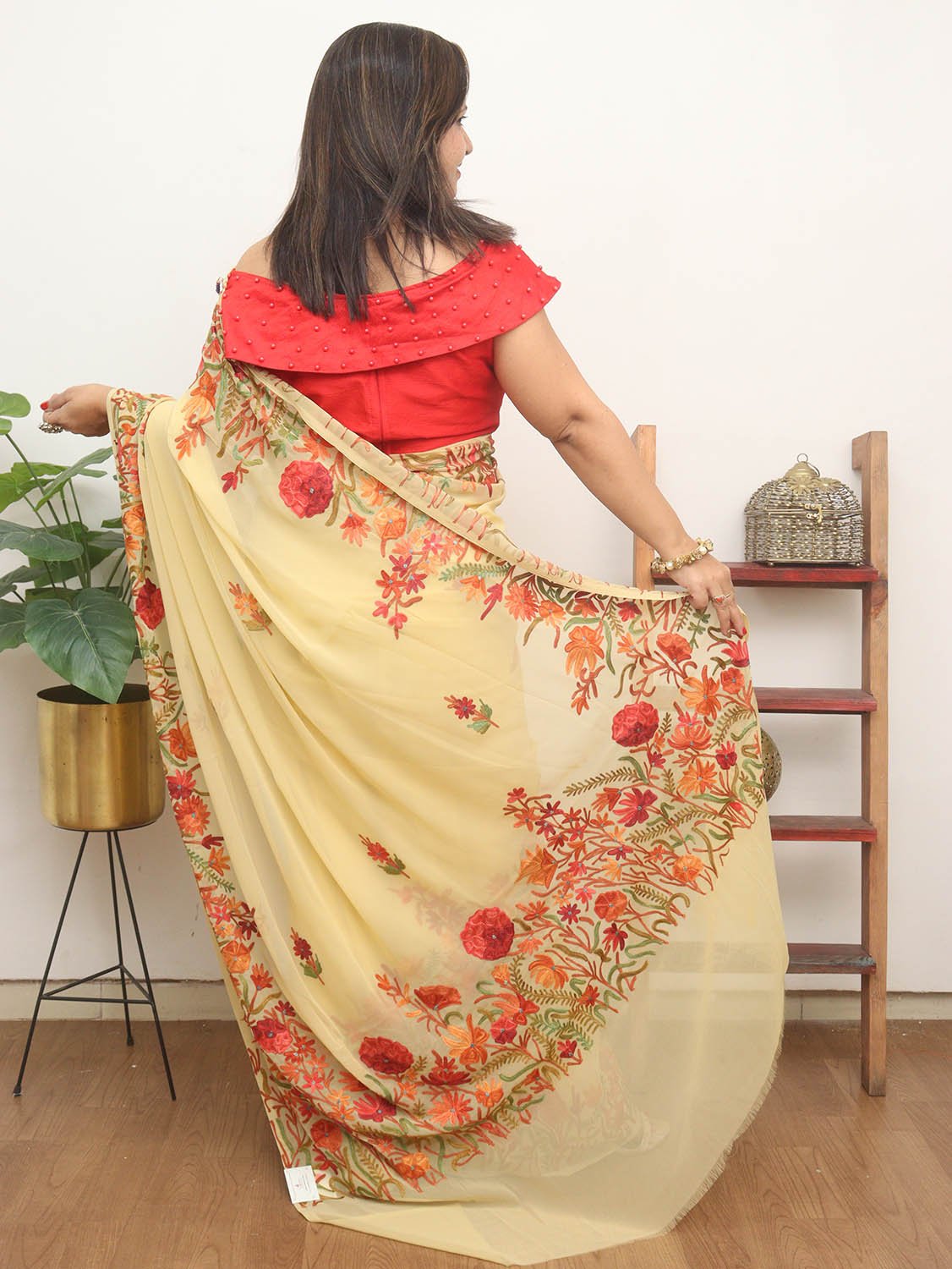 The beauty of Kashmir is not confined to its landscape. It extends to the beauty exhibited by myriad forms of its art work that brings about a delightful mold in fabric and garments. Kashmiri embroidery holds fantasy for women since time eternal. Aari work Sarees are exemplary in its own class by their sheer delicate nature of embroidered patterns.