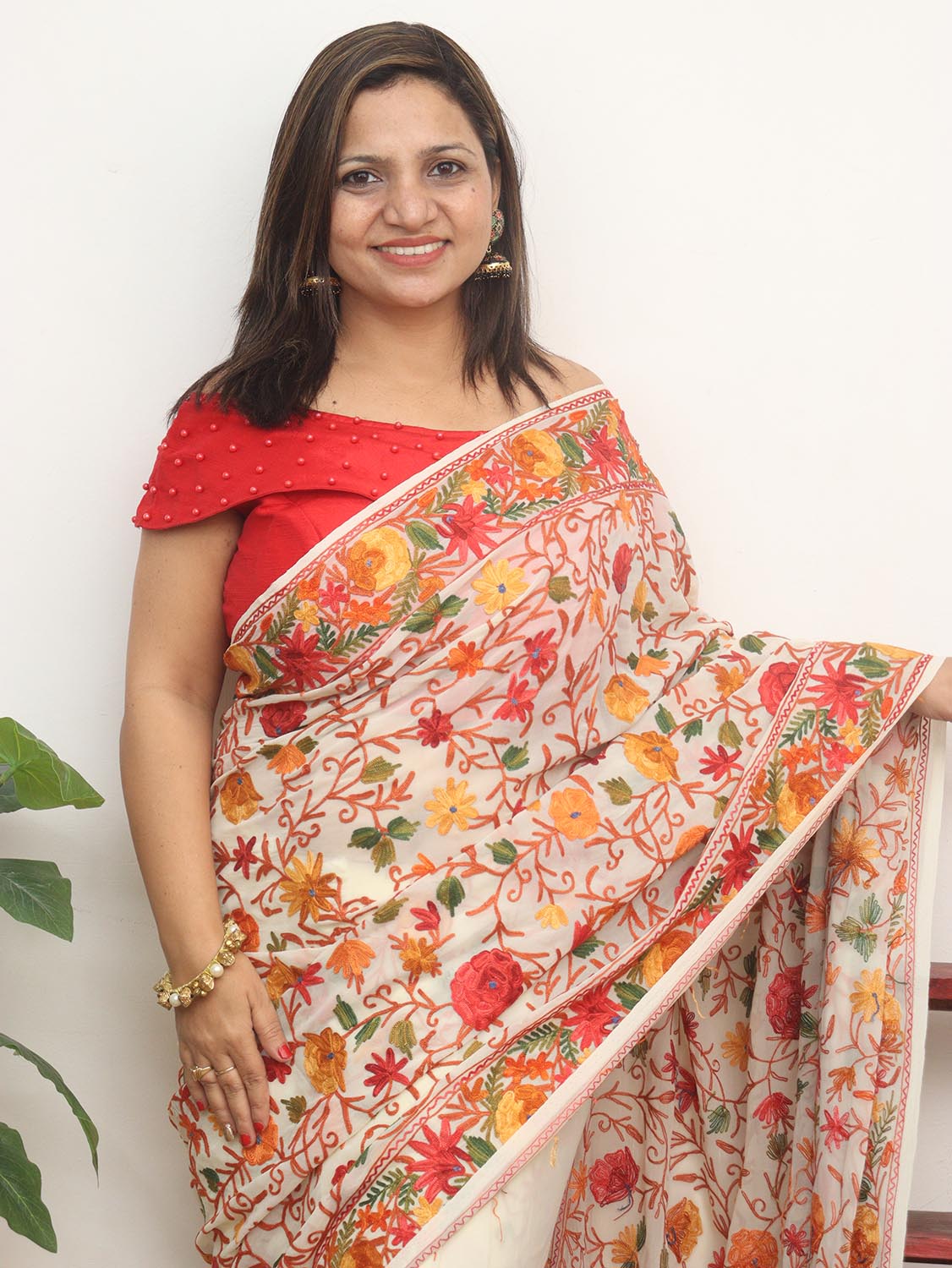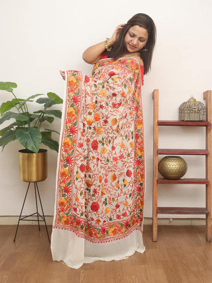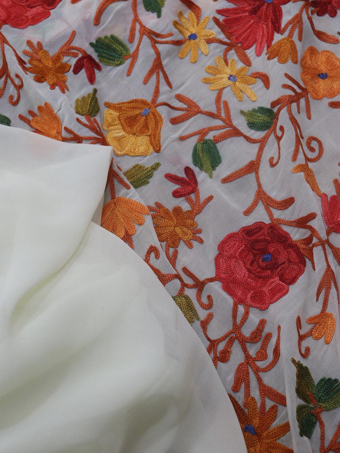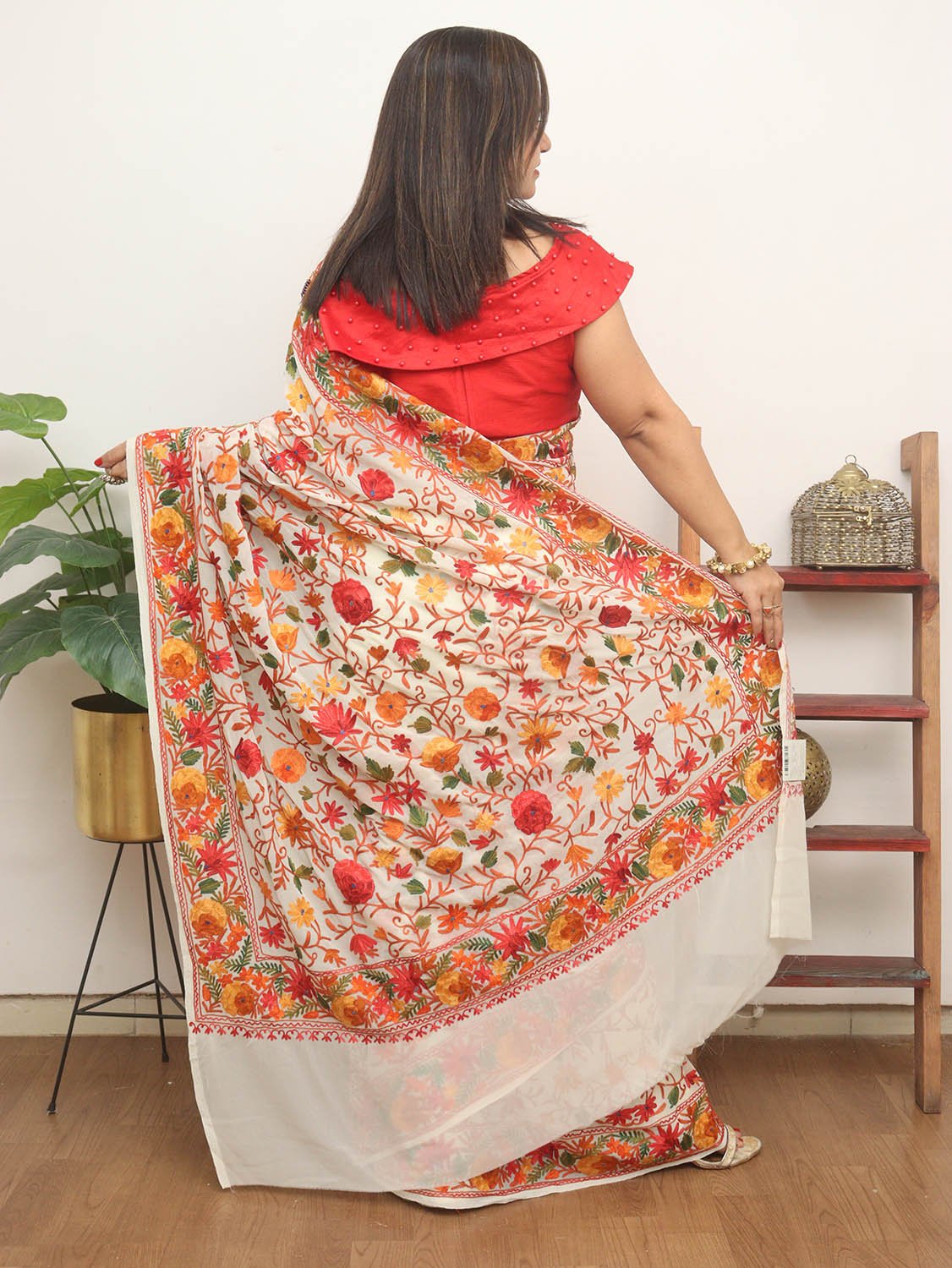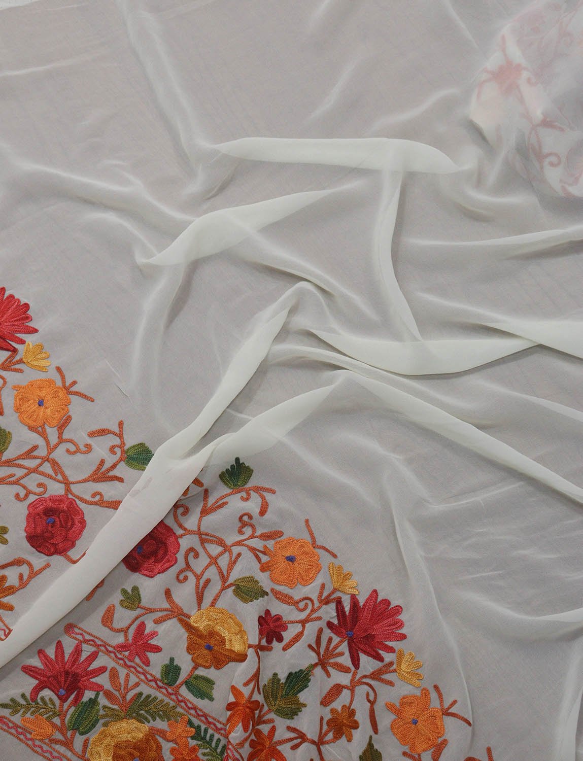 Off White Embroidered Kashmiri Aari Work Georgette Saree