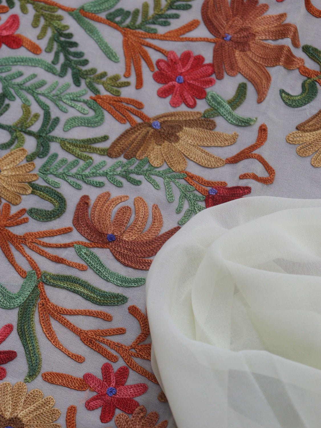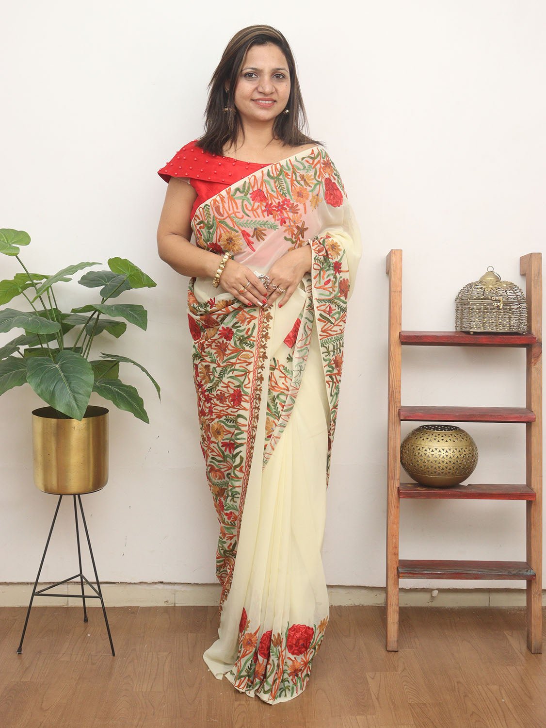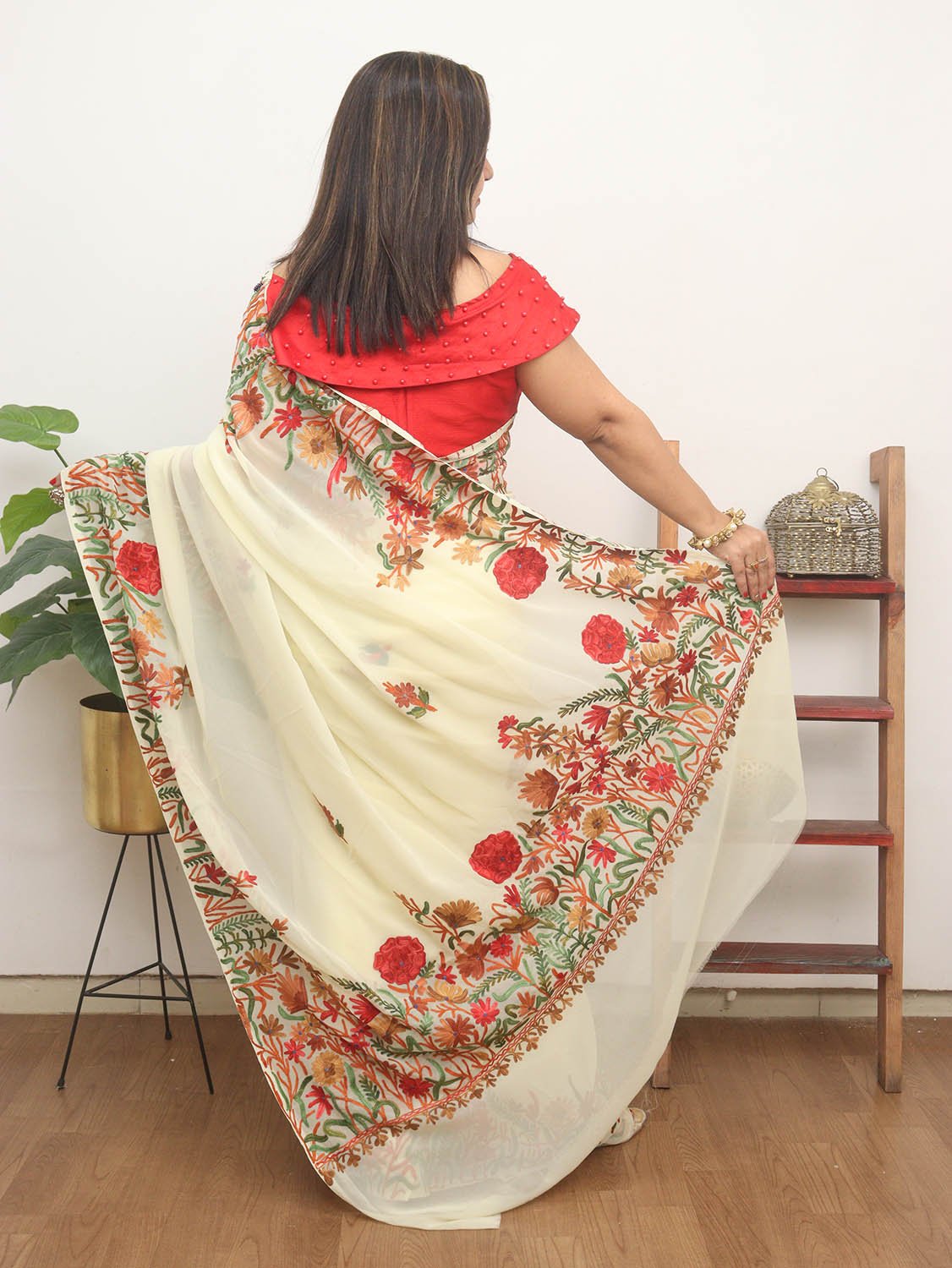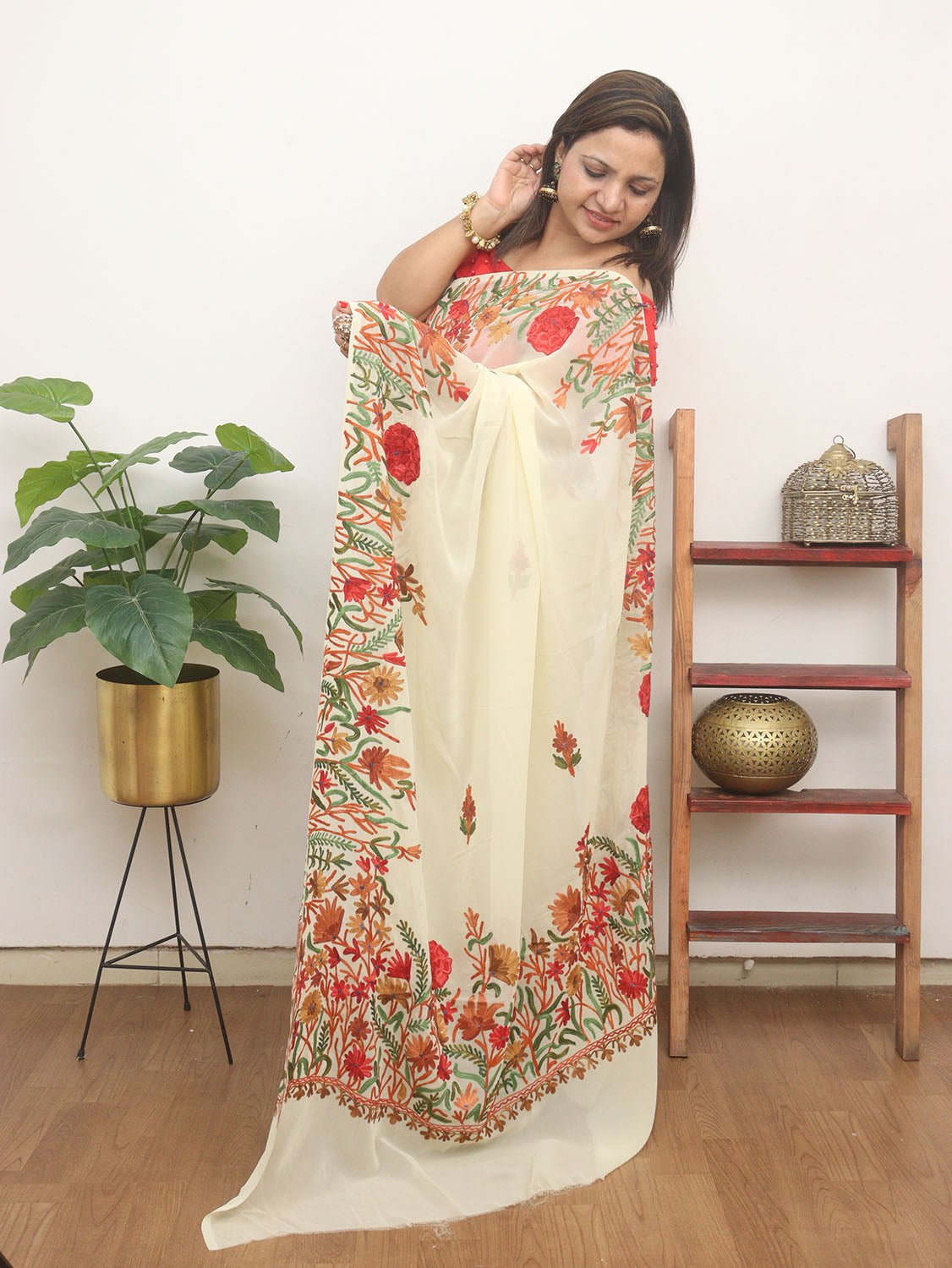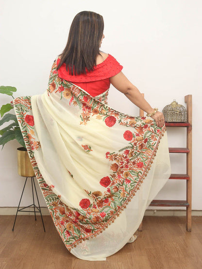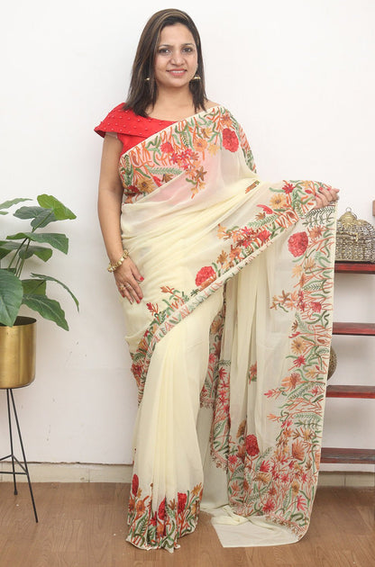 The beauty of Kashmir is not confined to its landscape. It extends to the beauty exhibited by myriad forms of its art work that brings about a delightful mold in fabric and garments. Kashmiri embroidery holds fantasy for women since time eternal. Aari work Sarees are exemplary in its own class by their sheer delicate nature of embroidered patterns.