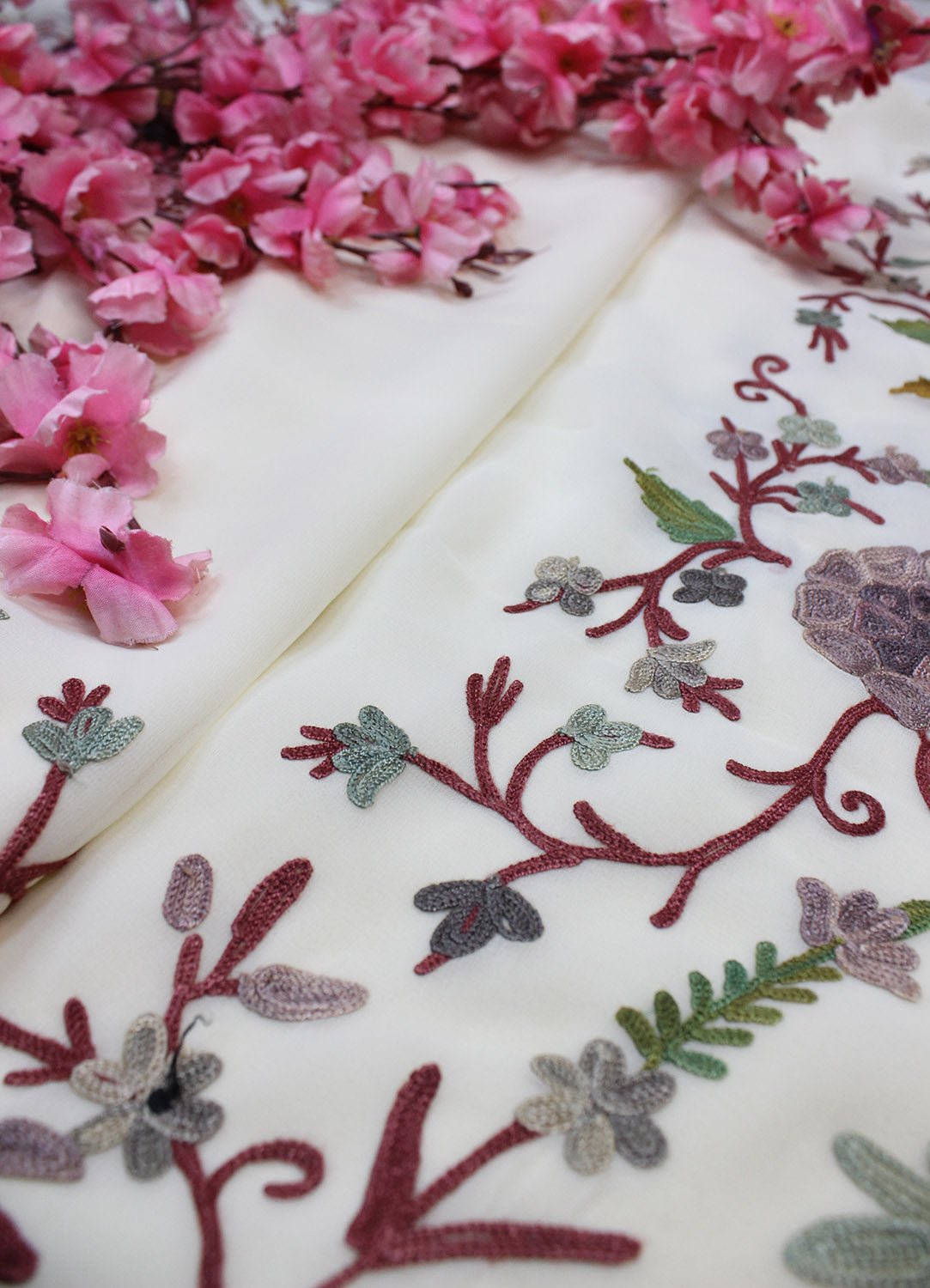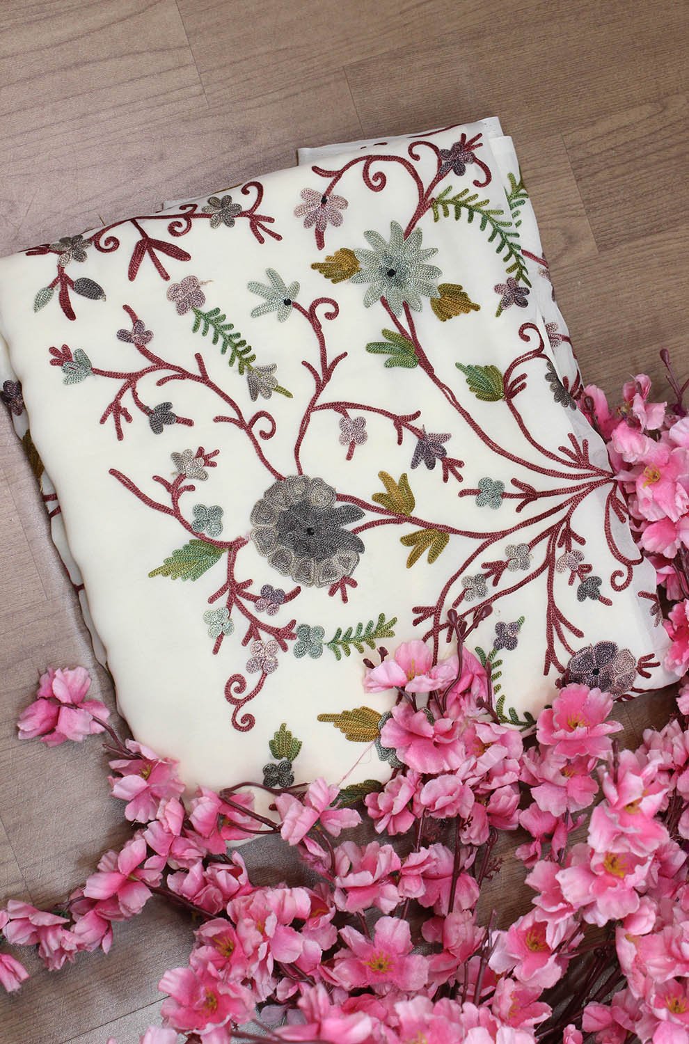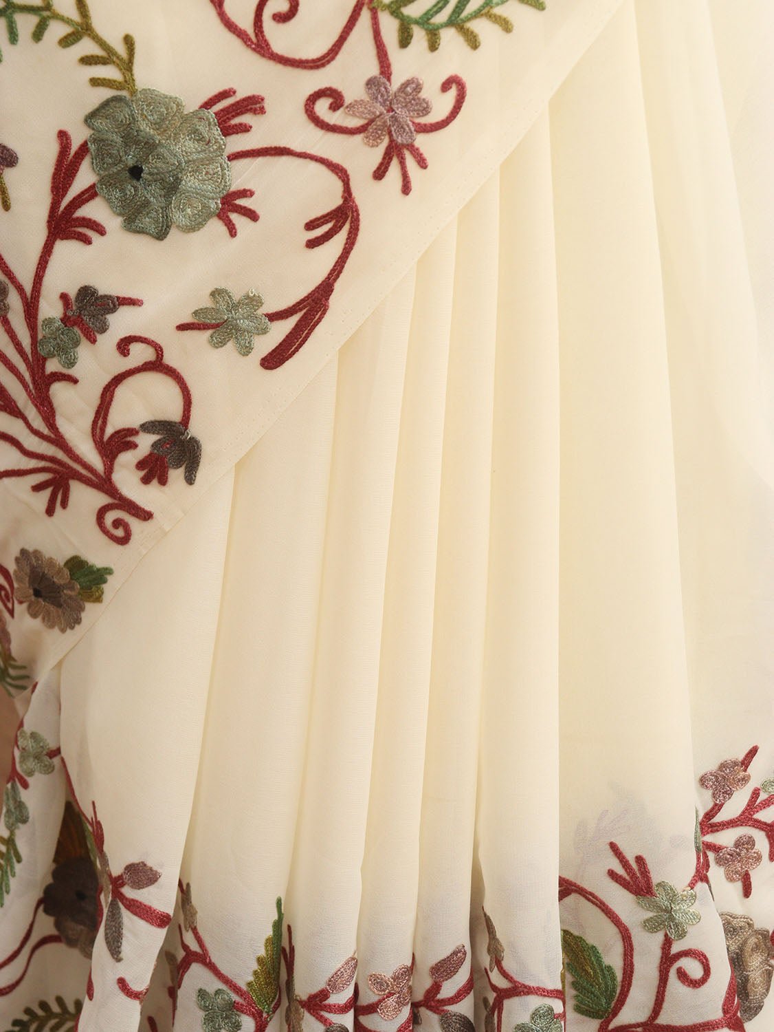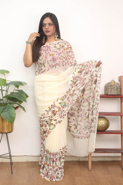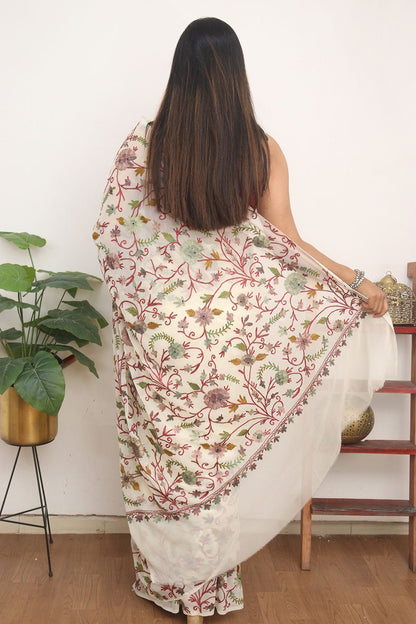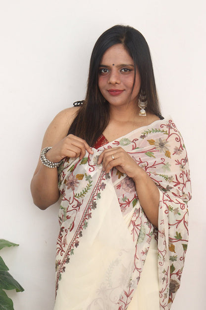 Off White Embroidered Kashmiri Aari Work Georgette Saree