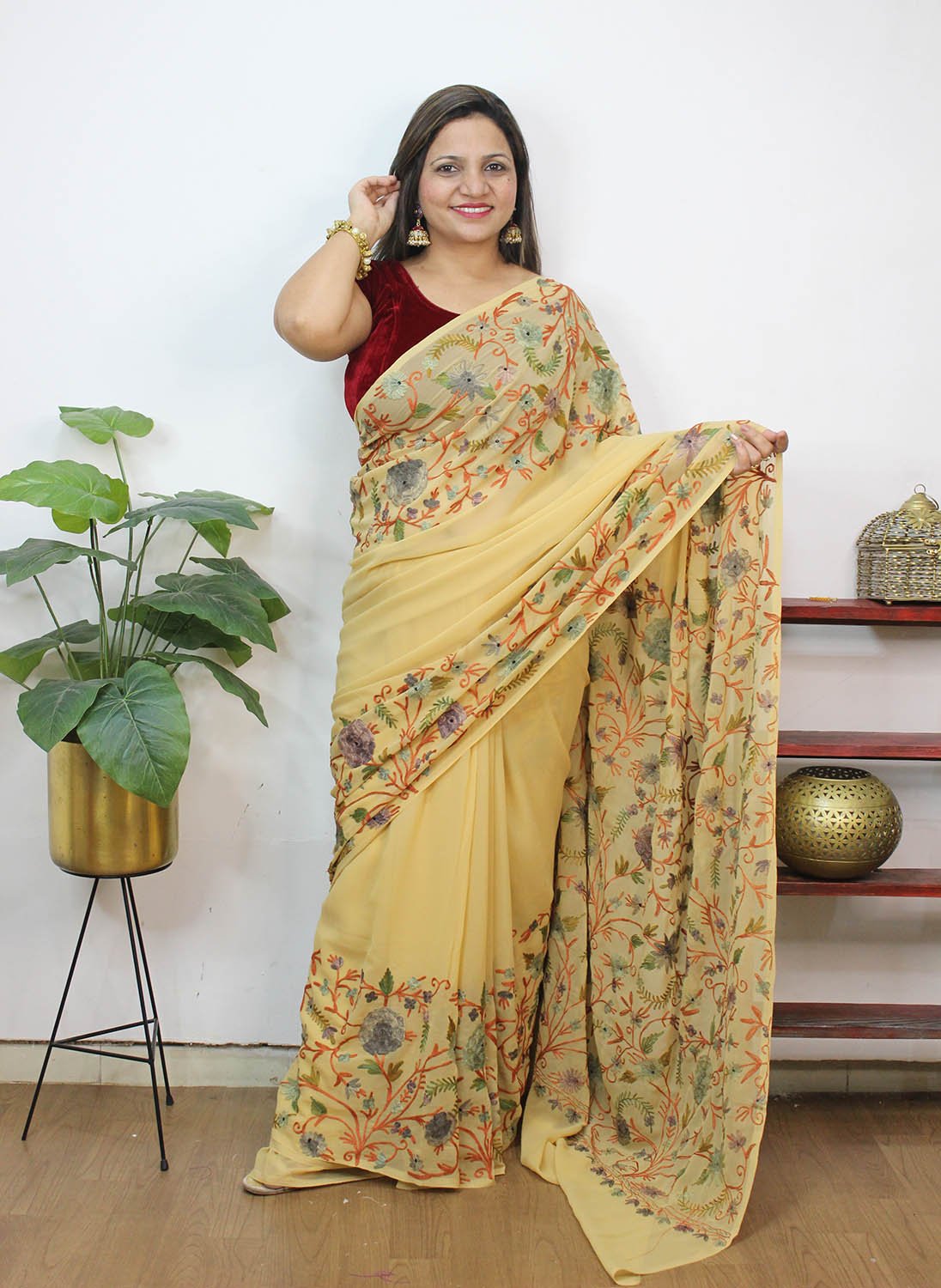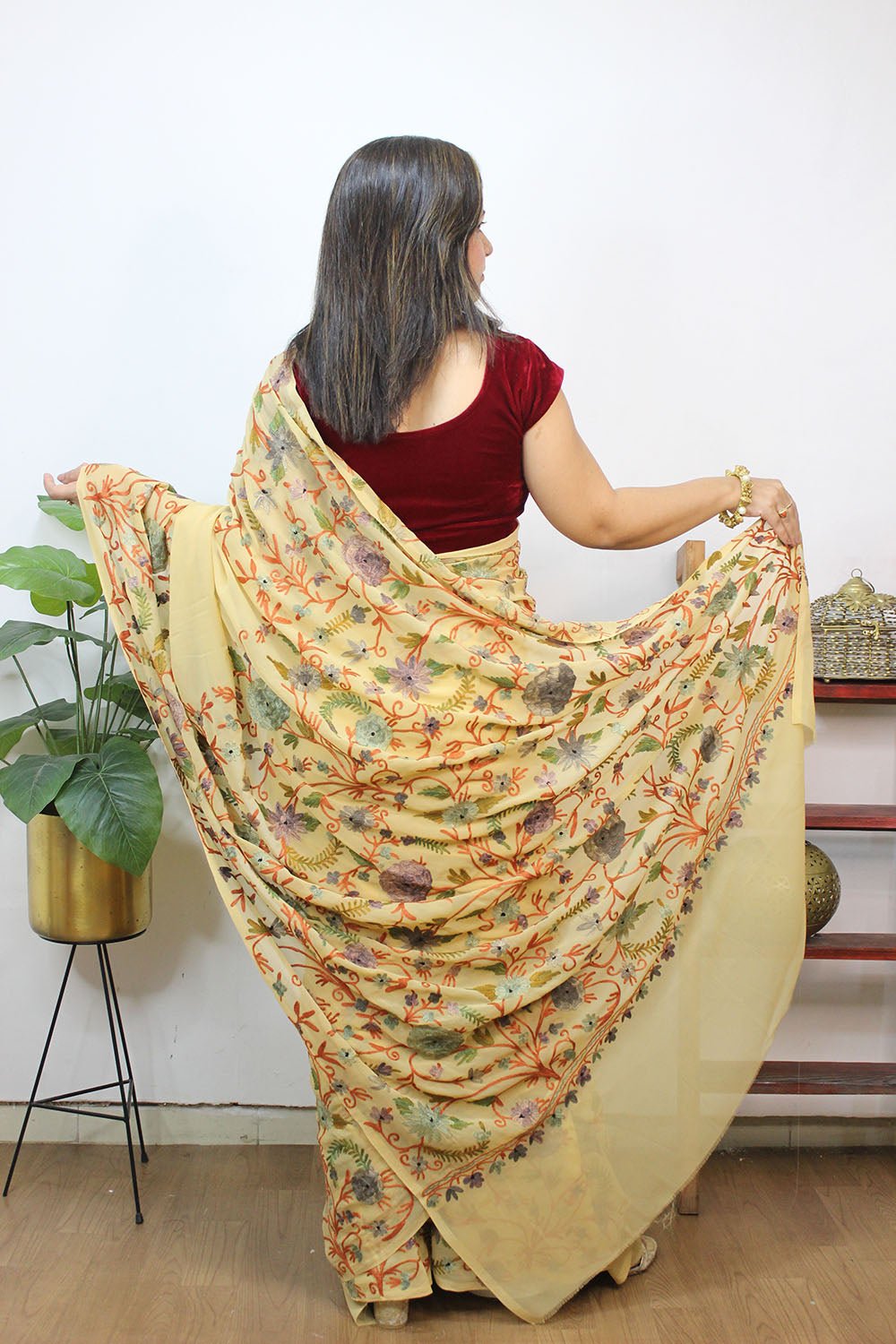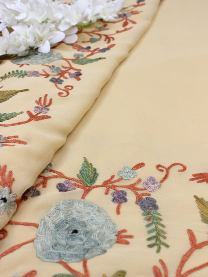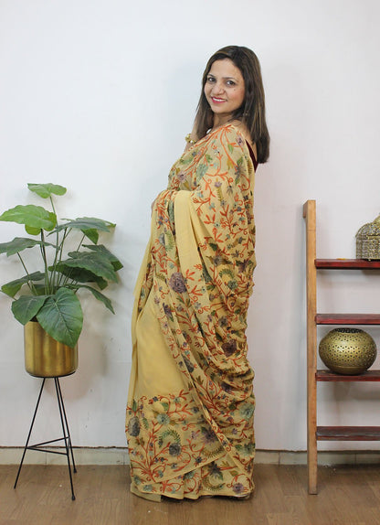 The beauty of Kashmir is not confined to its landscape. It extends to the beauty exhibited by myriad forms of its art work that brings about a delightful mold in fabric and garments. Kashmiri embroidery holds fantasy for women since time eternal. Aari work Sarees are exemplary in its own class by their sheer delicate nature of embroidered patterns.