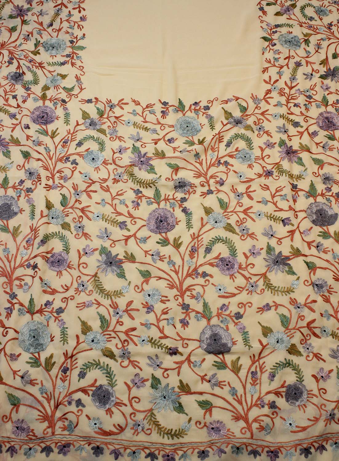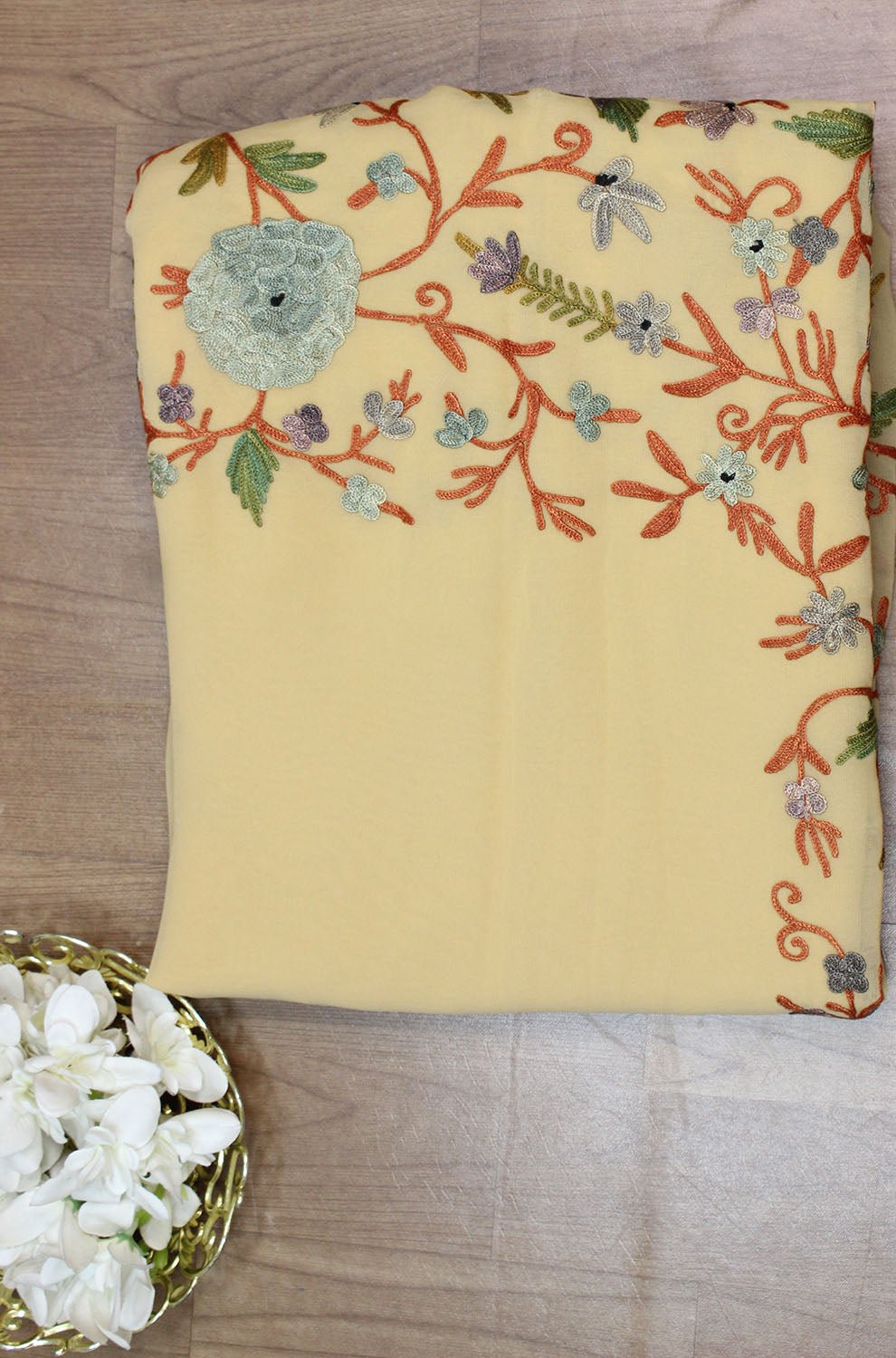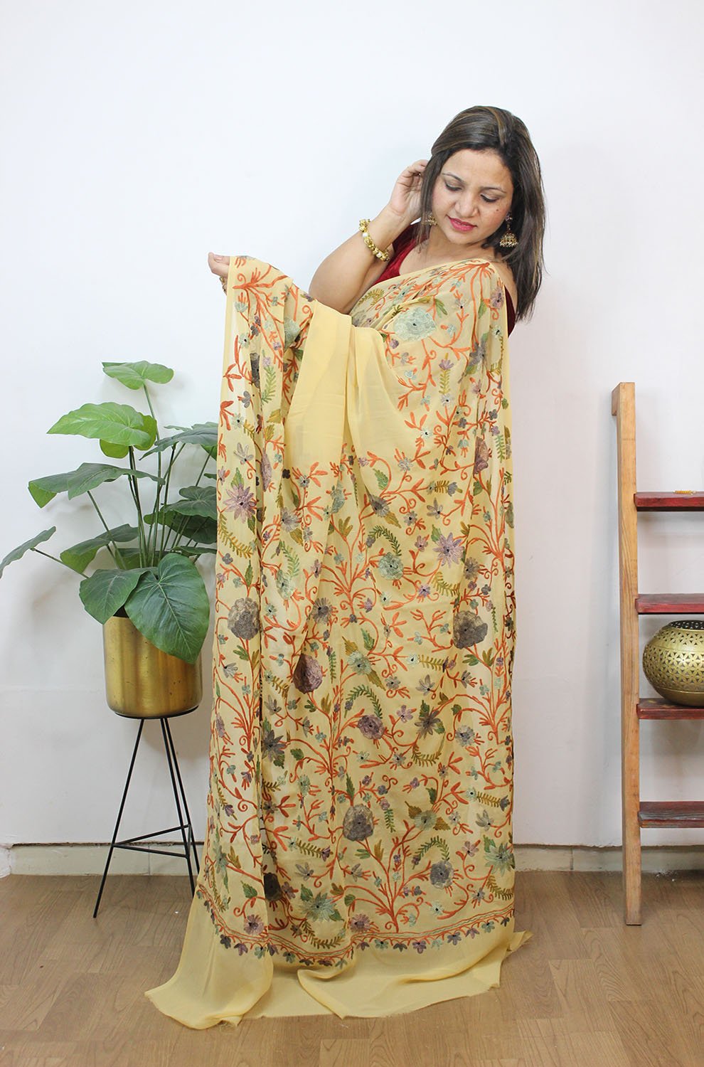 The beauty of Kashmir is not confined to its landscape. It extends to the beauty exhibited by myriad forms of its art work that brings about a delightful mold in fabric and garments. Kashmiri embroidery holds fantasy for women since time eternal. Aari work Sarees are exemplary in its own class by their sheer delicate nature of embroidered patterns.