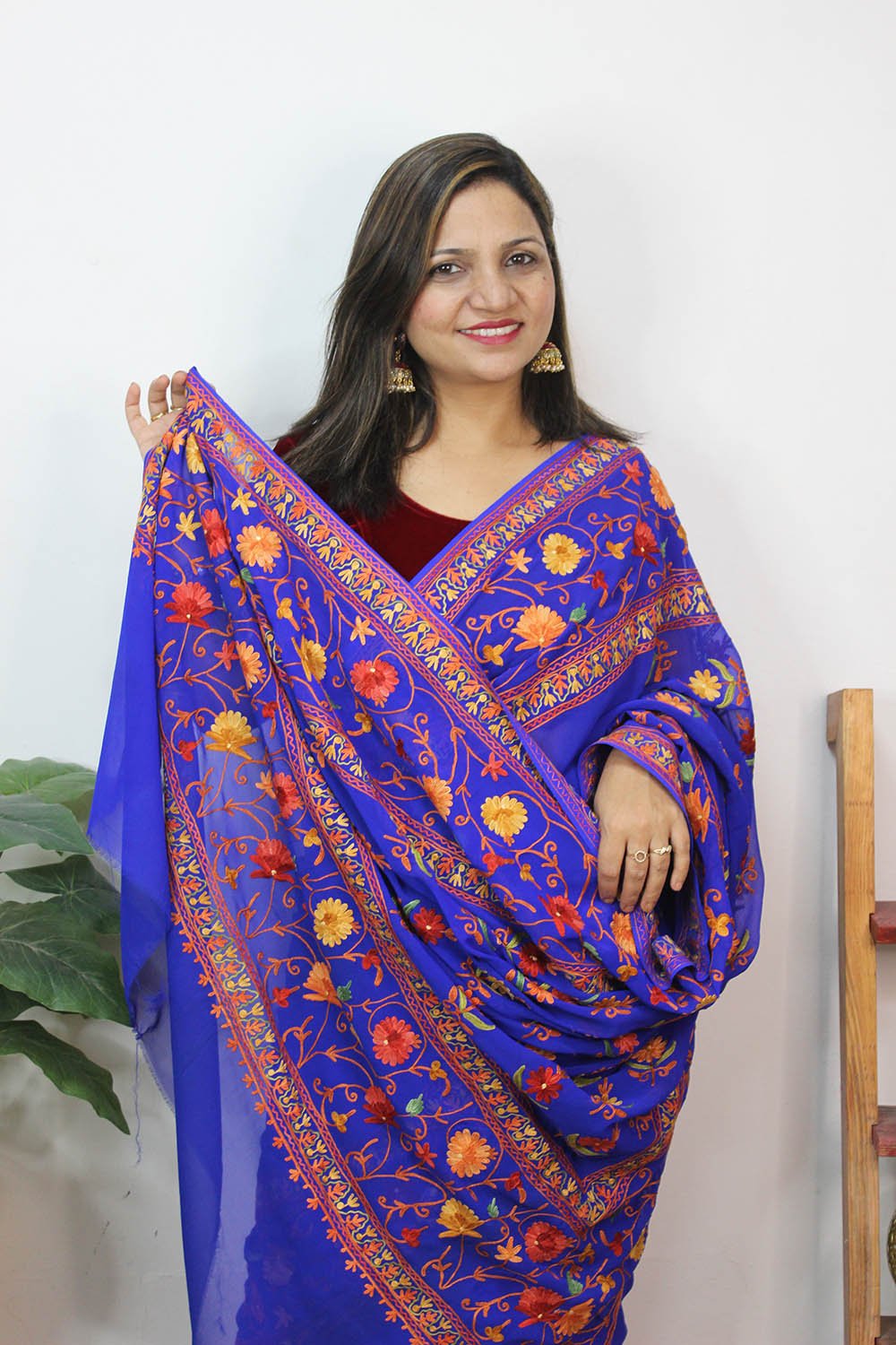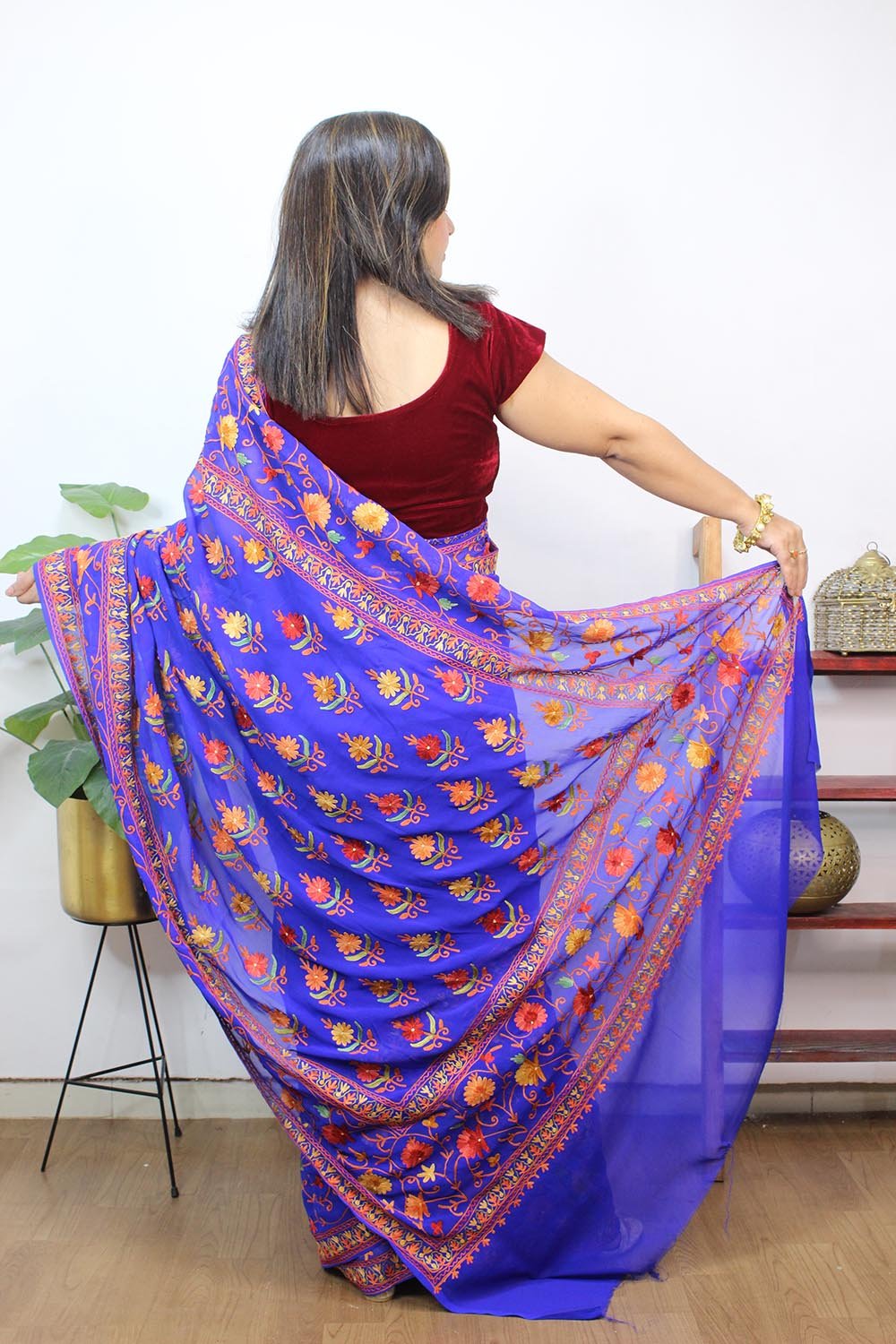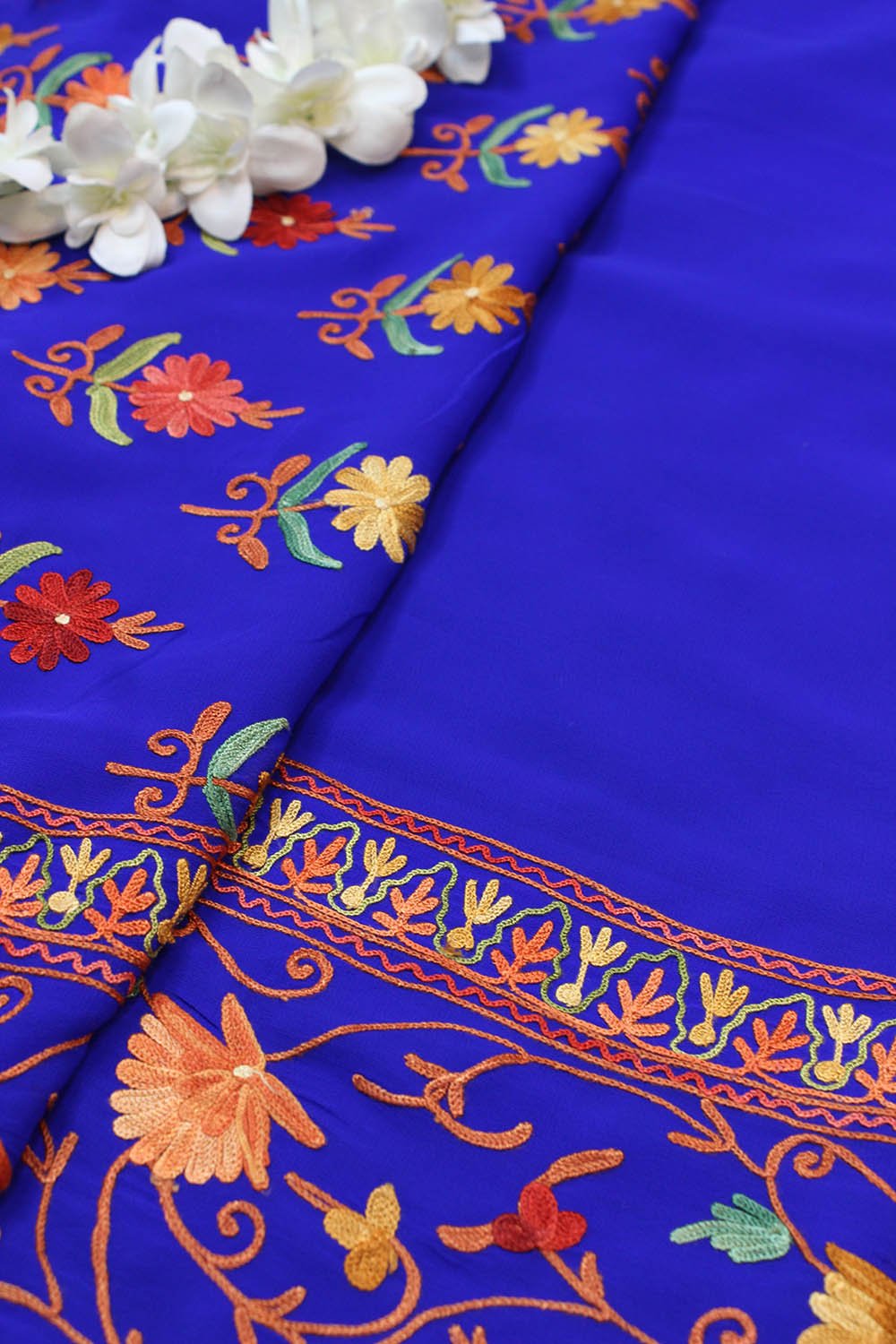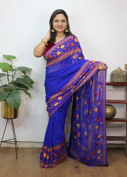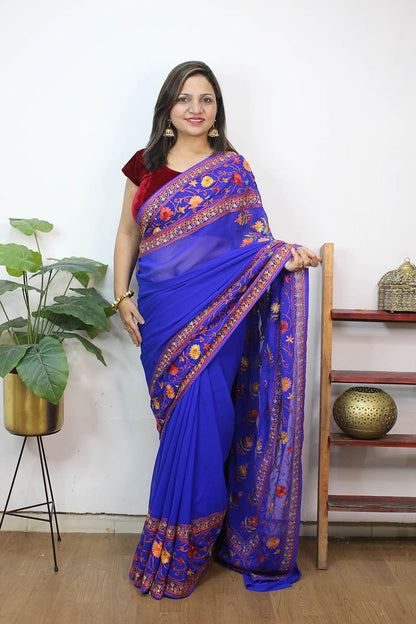 The beauty of Kashmir is not confined to its landscape. It extends to the beauty exhibited by myriad forms of its art work that brings about a delightful mold in fabric and garments. Kashmiri embroidery holds fantasy for women since time eternal. Aari work Sarees are exemplary in its own class by their sheer delicate nature of embroidered patterns.