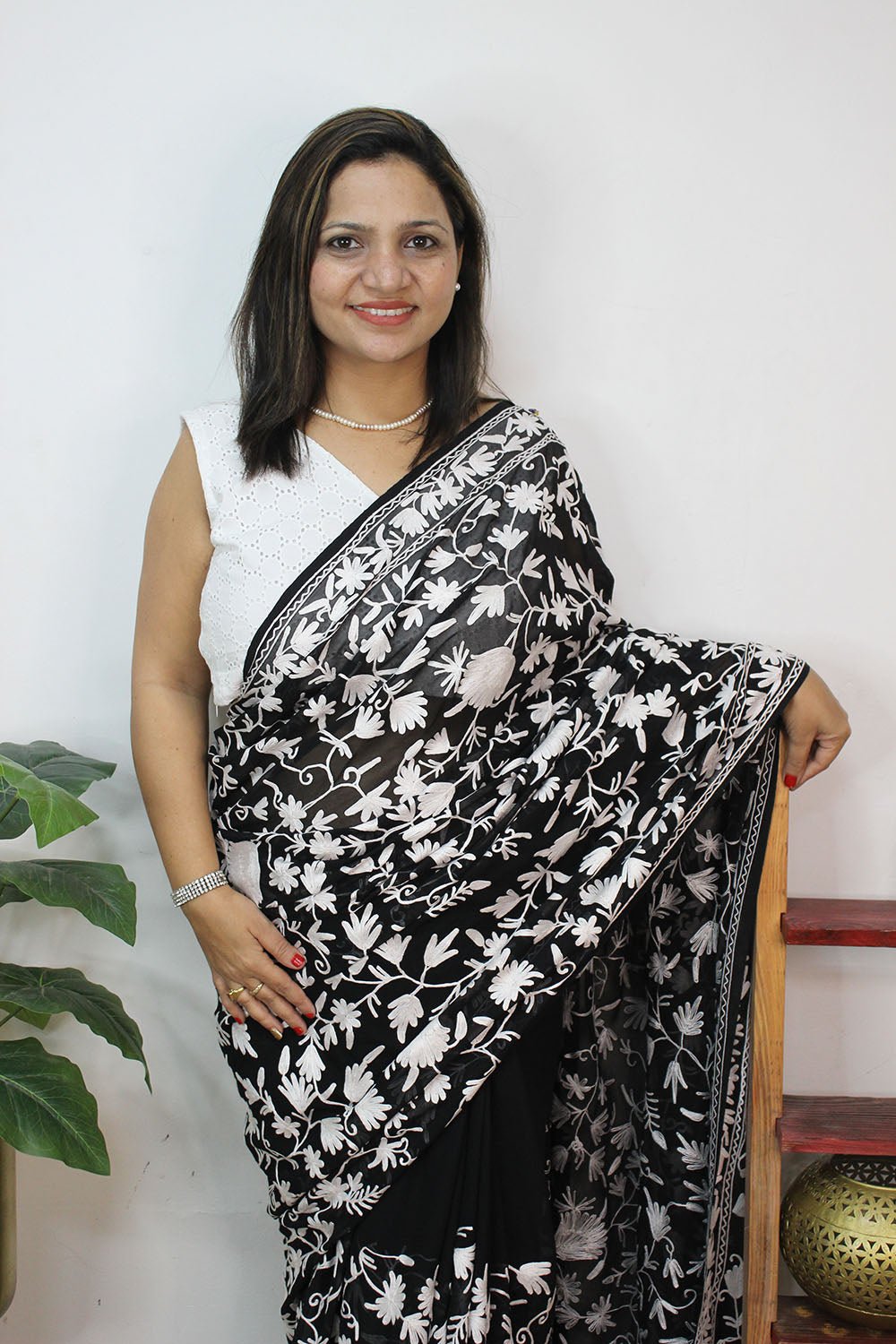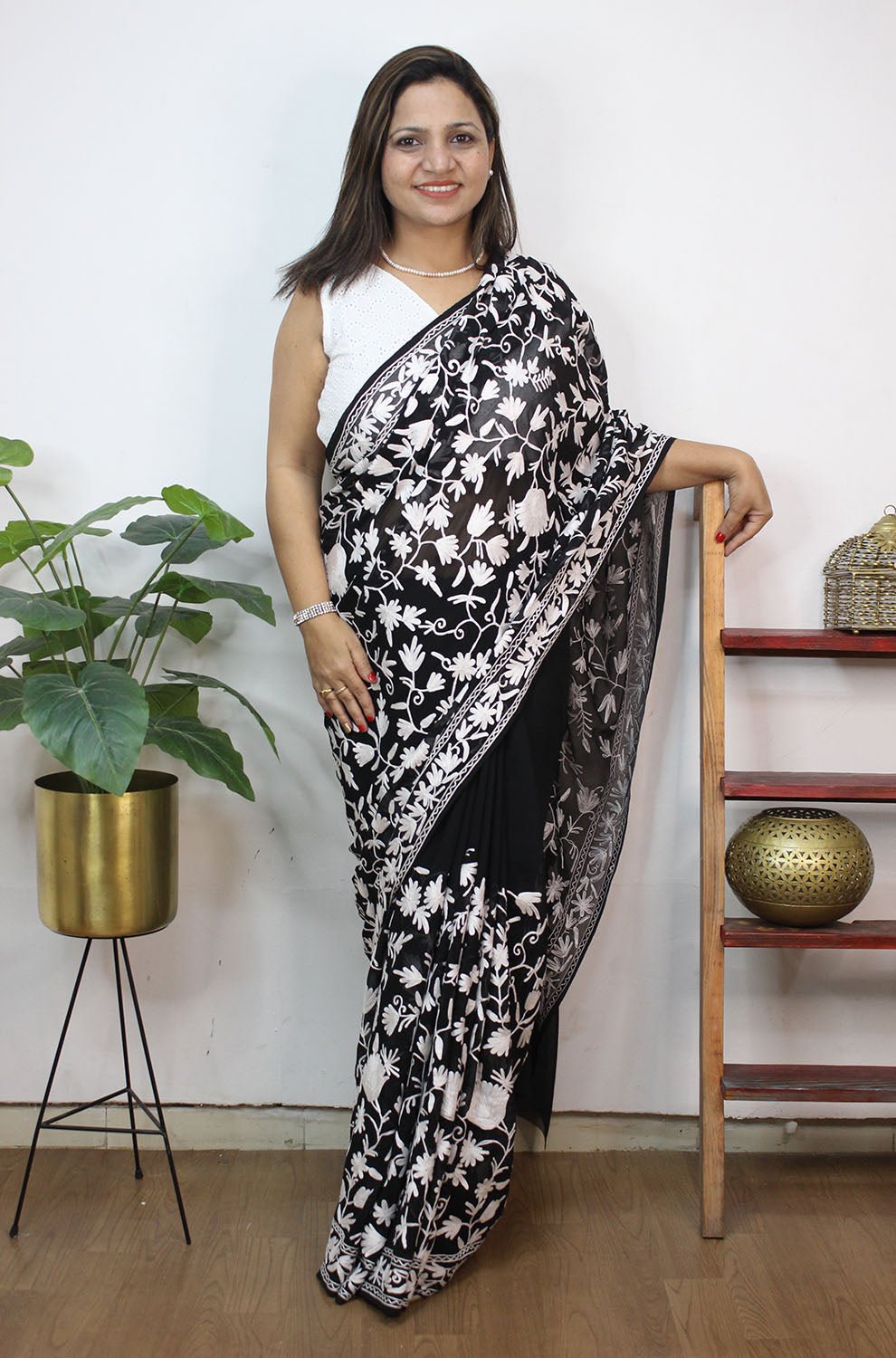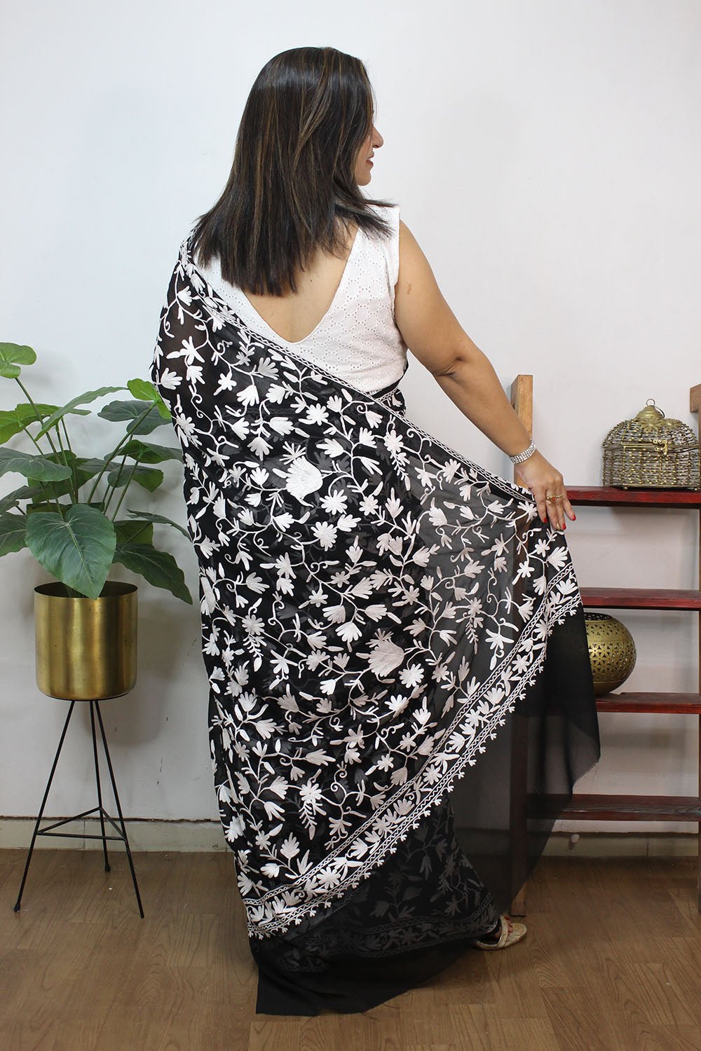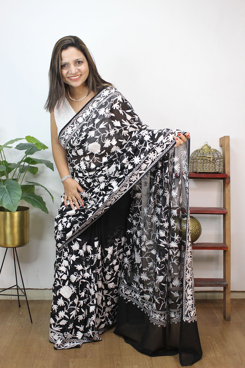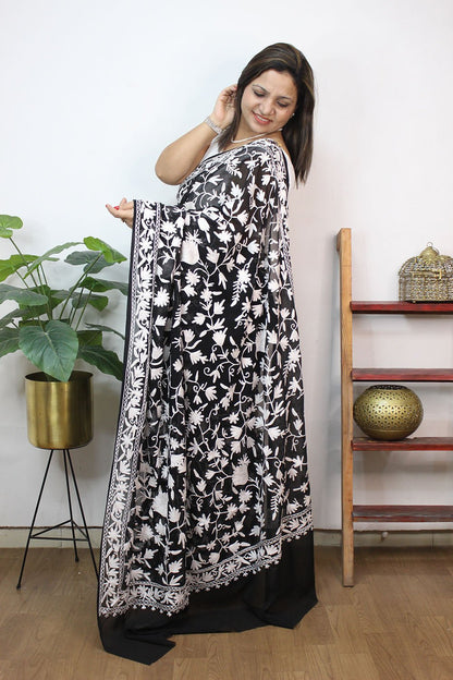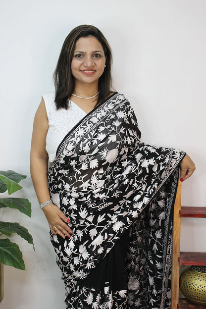Black Embroidered Kashmiri Aari Work Georgette Saree