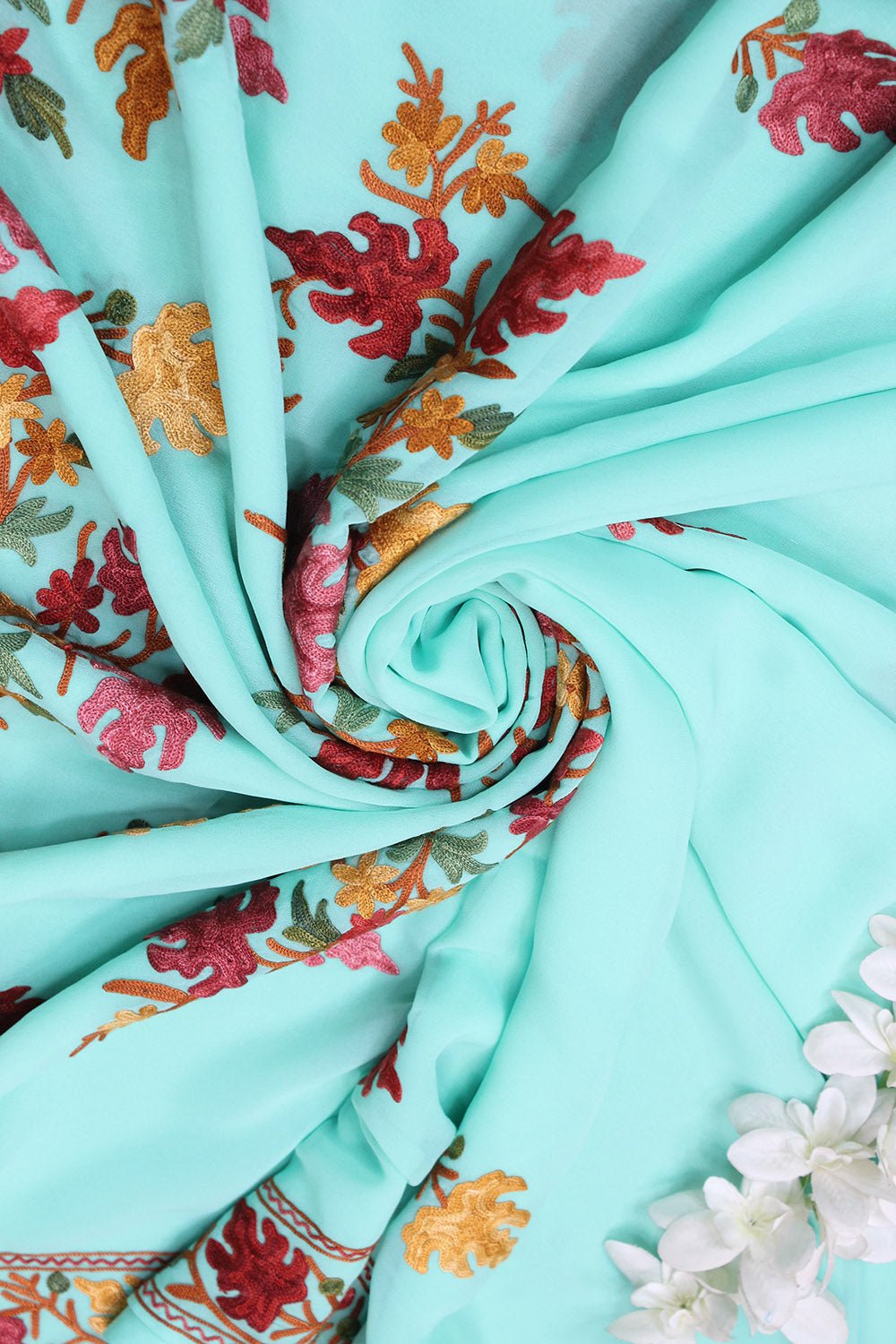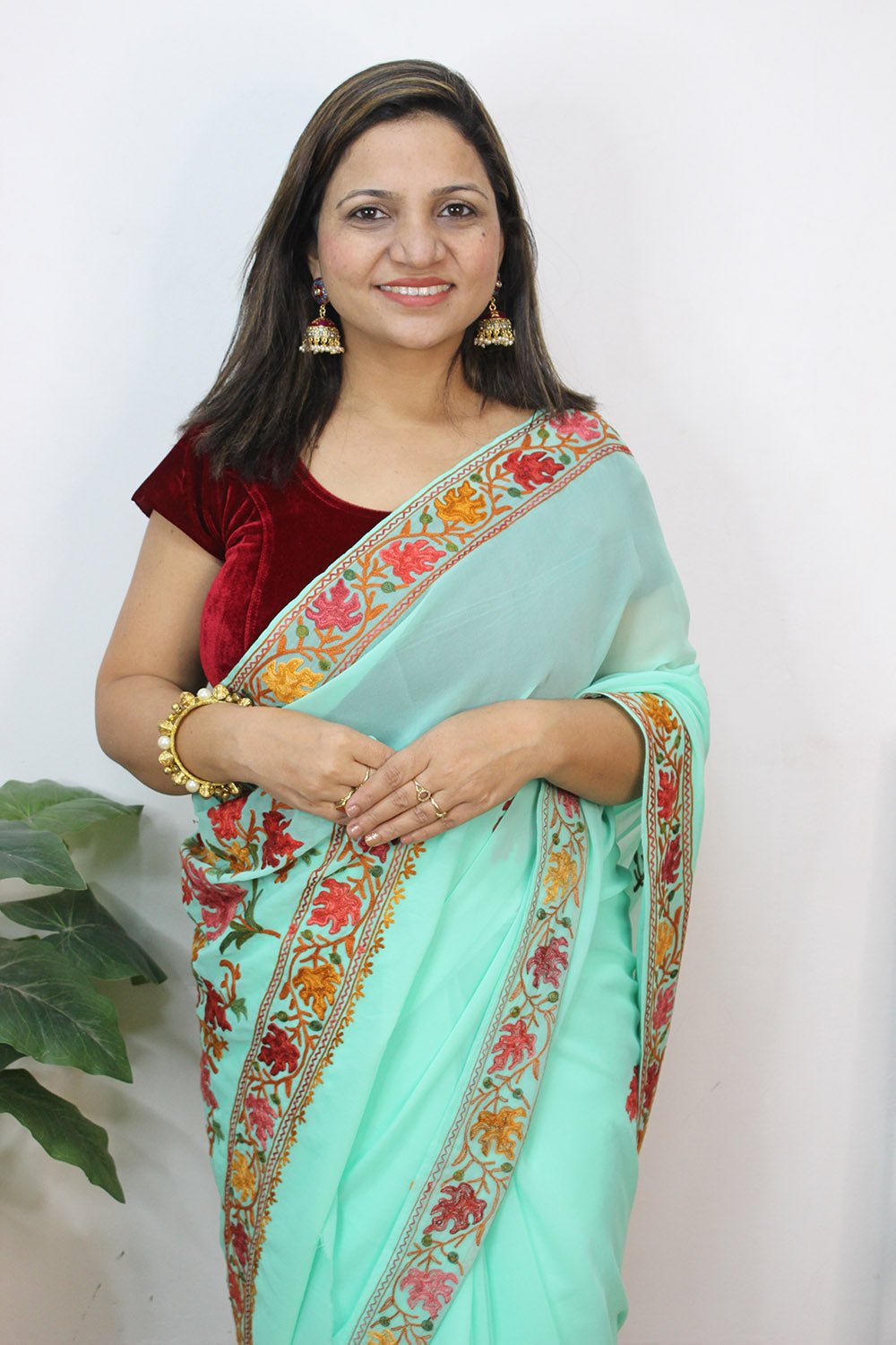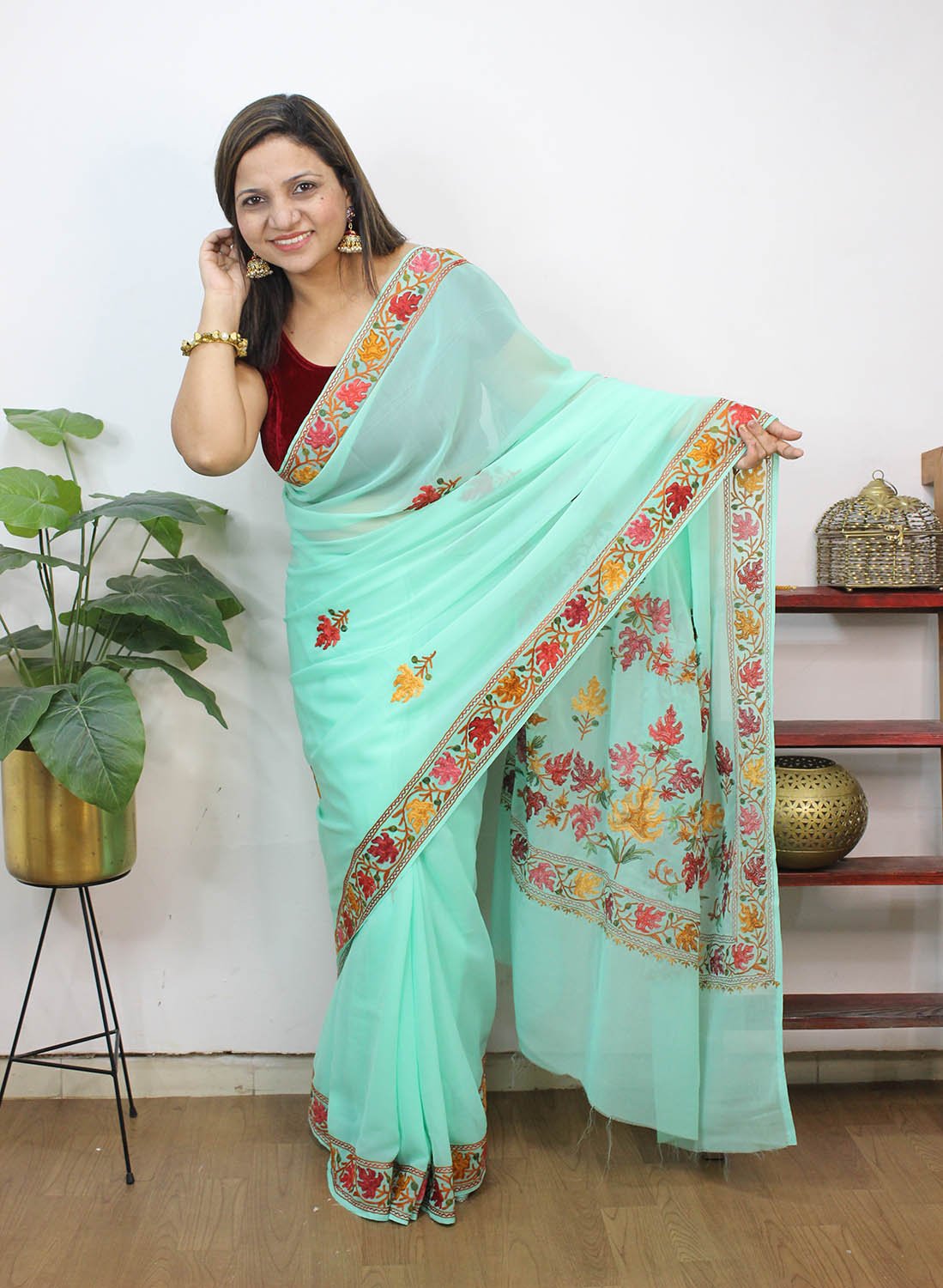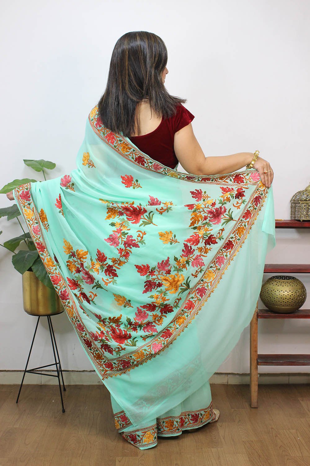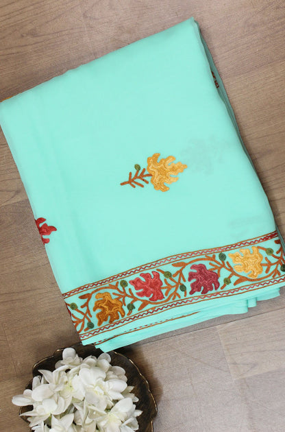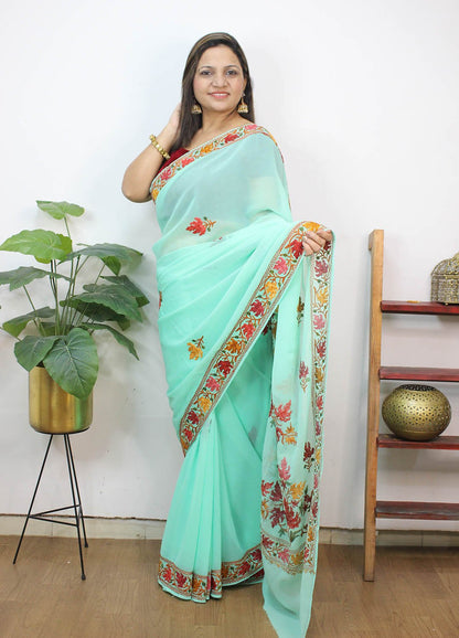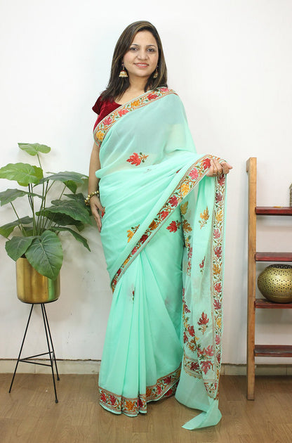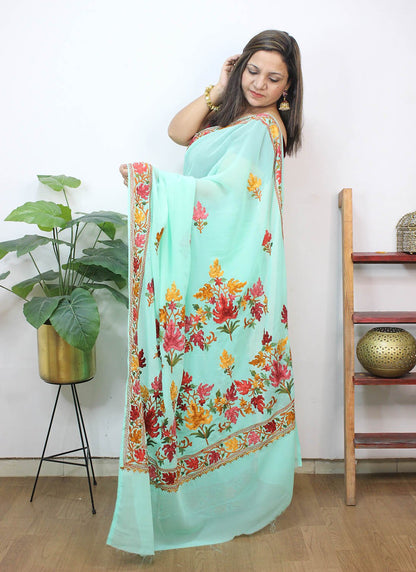 The beauty of Kashmir is not confined to its landscape. It extends to the beauty exhibited by myriad forms of its art work that brings about a delightful mold in fabric and garments. Kashmiri embroidery holds fantasy for women since time eternal. Aari work Sarees are exemplary in its own class by their sheer delicate nature of embroidered patterns.