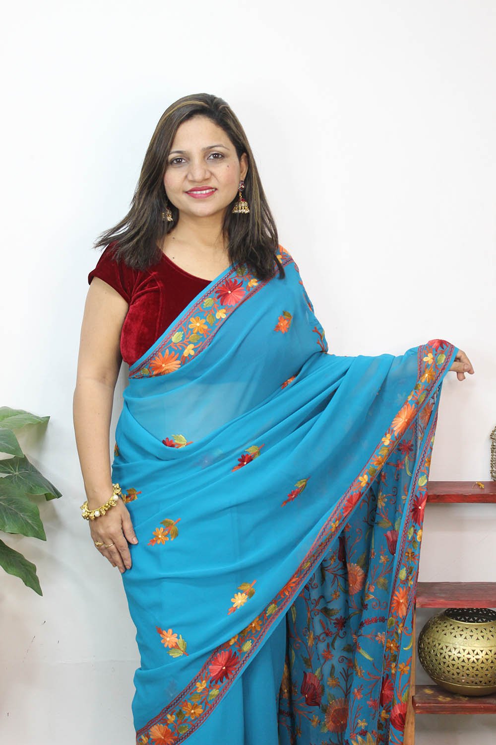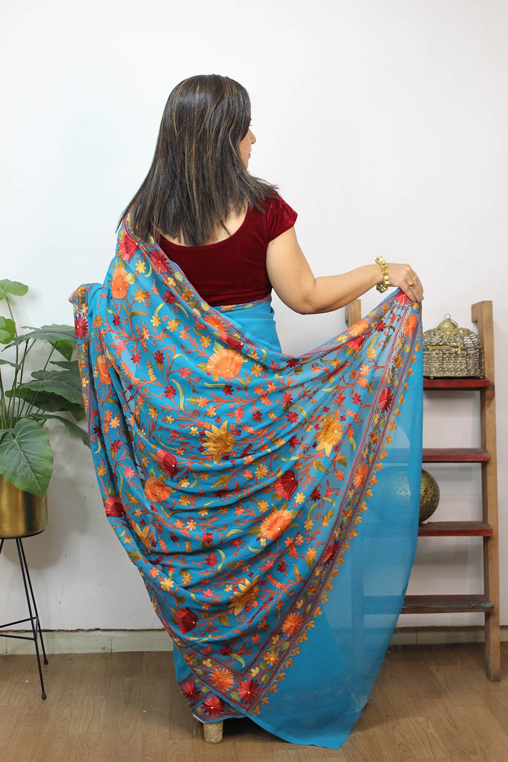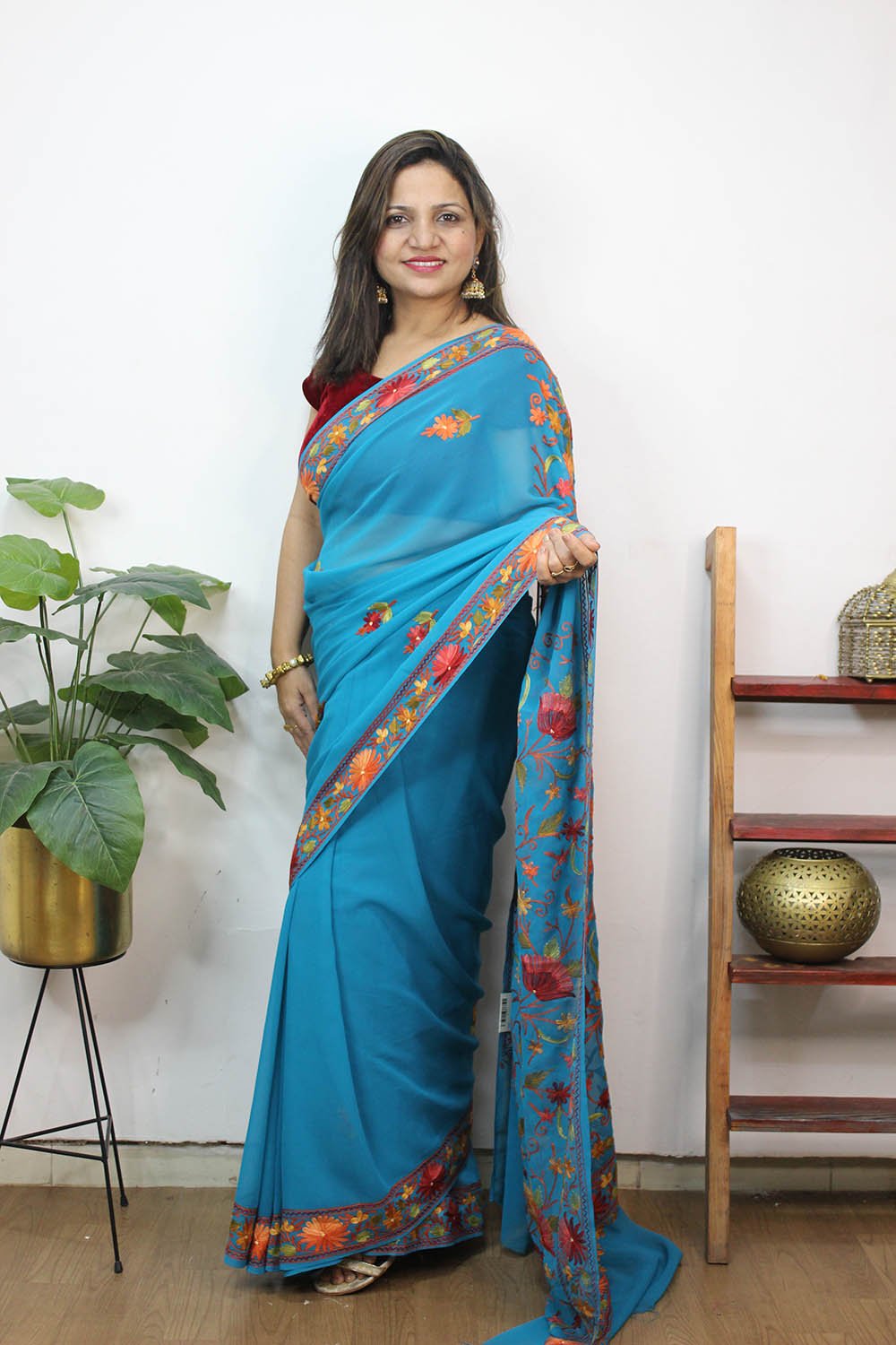Blue Embroidered Kashmiri Aari Work Georgette Saree