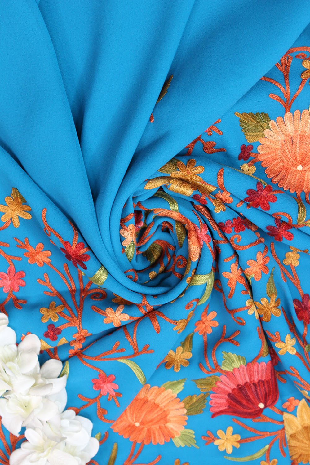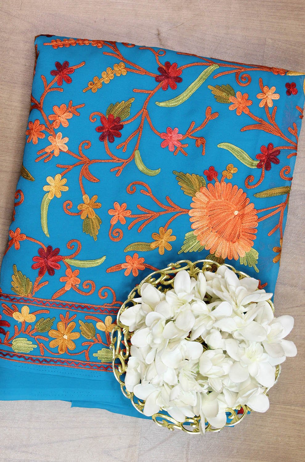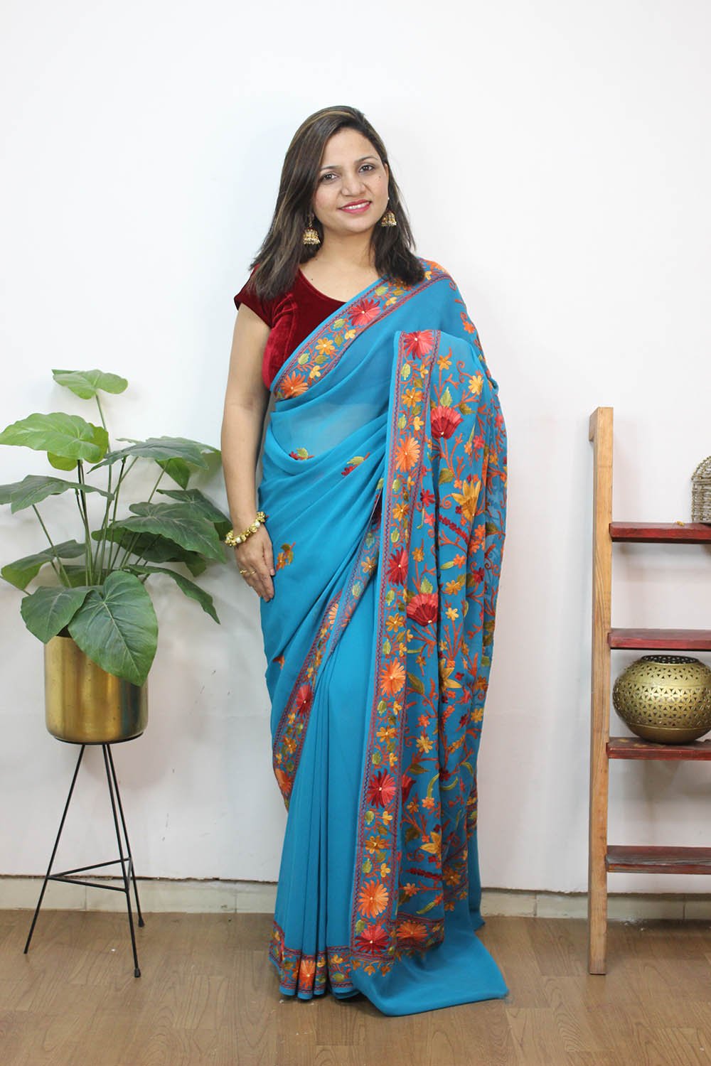 Blue Embroidered Kashmiri Aari Work Georgette Saree