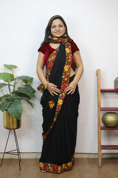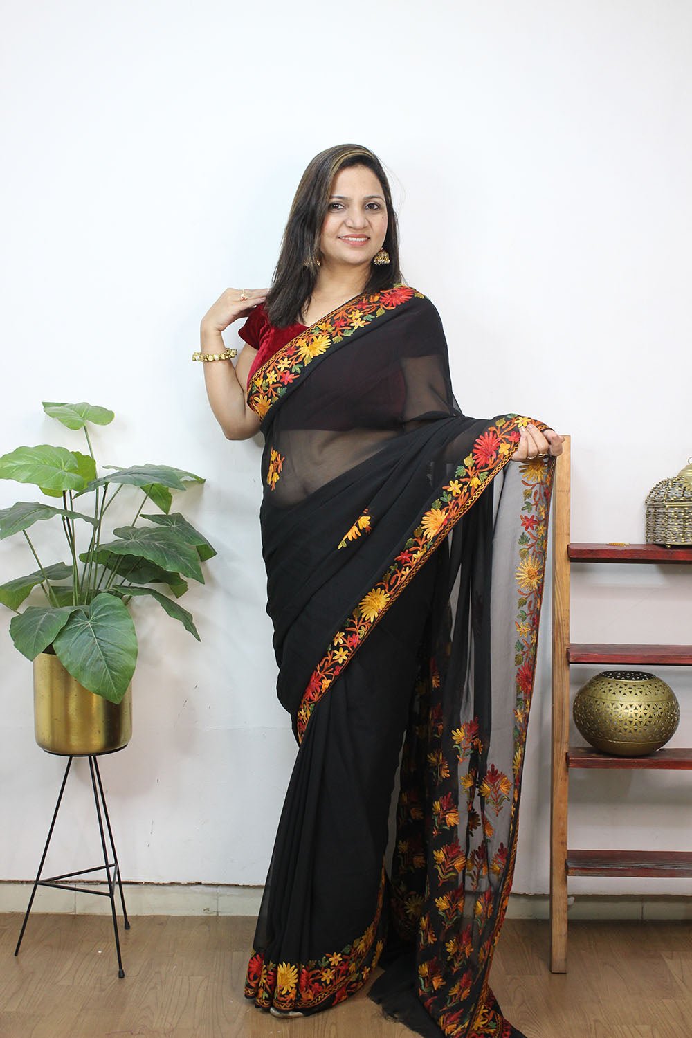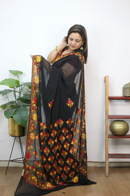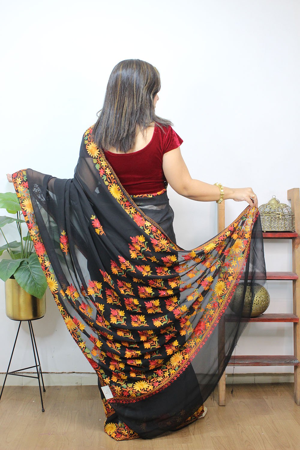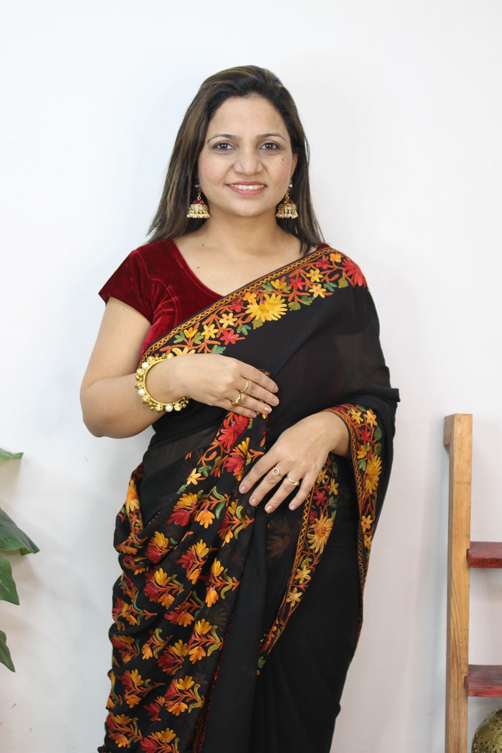 The beauty of Kashmir is not confined to its landscape. It extends to the beauty exhibited by myriad forms of its art work that brings about a delightful mold in fabric and garments. Kashmiri embroidery holds fantasy for women since time eternal. Aari work Sarees are exemplary in its own class by their sheer delicate nature of embroidered patterns.