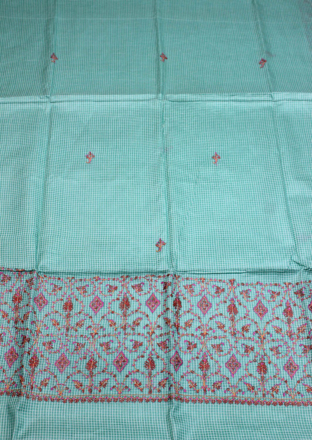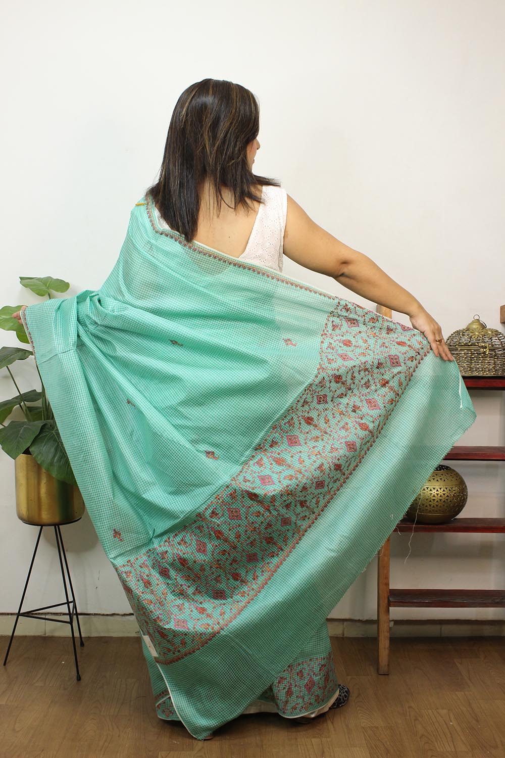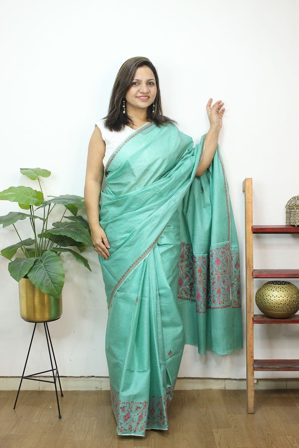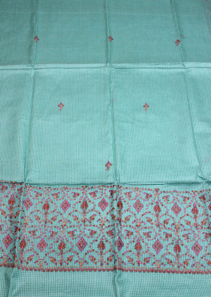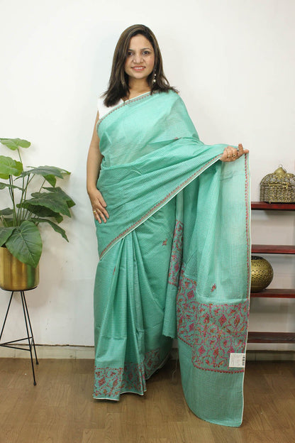 From our exclusive collection of Kashmiri Craftsmen, this is a Kashmiri Saree with Blouse which you would love to have it in your wardrobe. This Saree is a perfect occasion wear. Its an exclusive saree embroidered and a fresh collection directly from weavers in Kashmir. Sozni (or suzani) embroidery is a style of embroidery from the Jammu and Kashmir region. (It Comes With Contrast Blouse Piece).