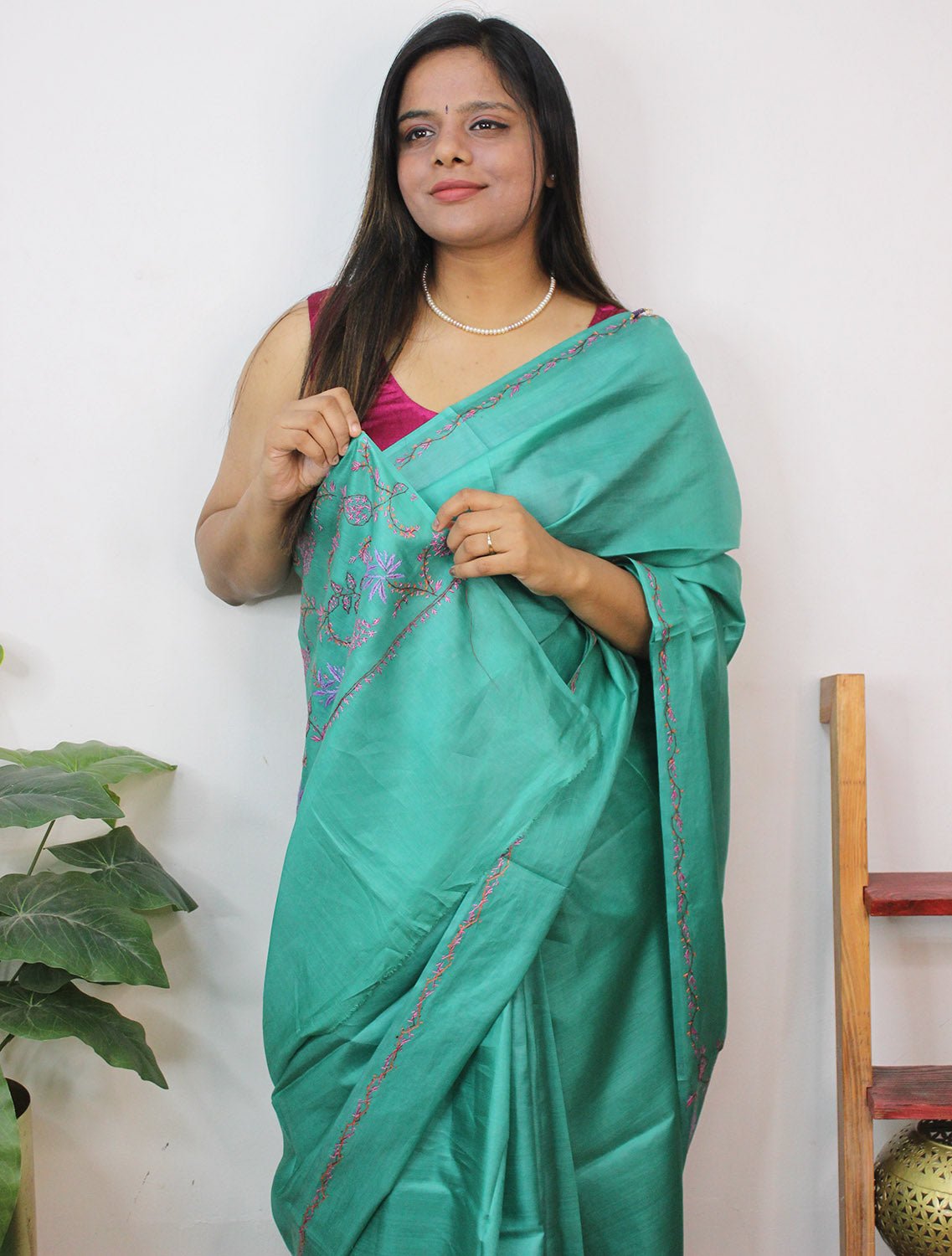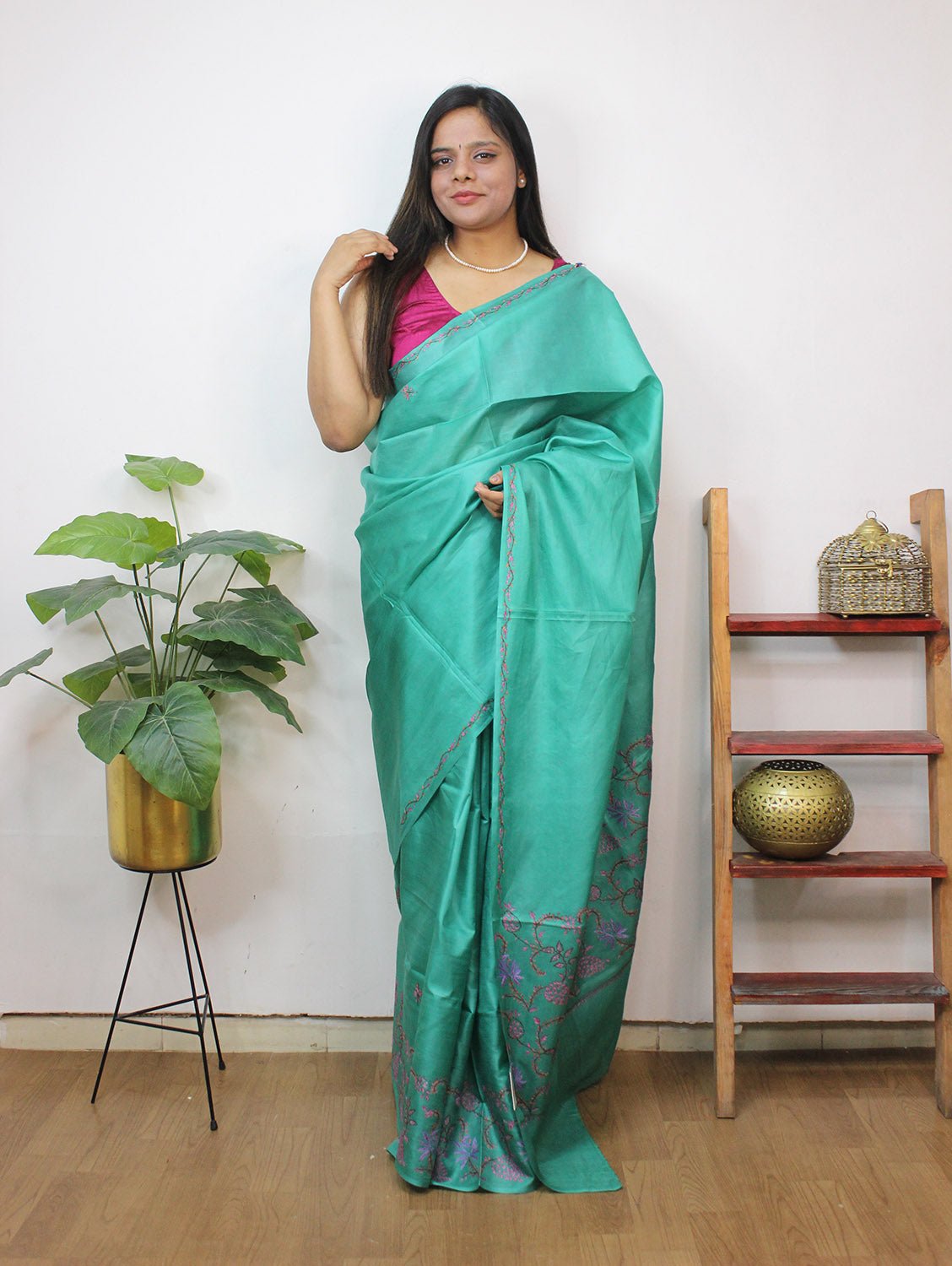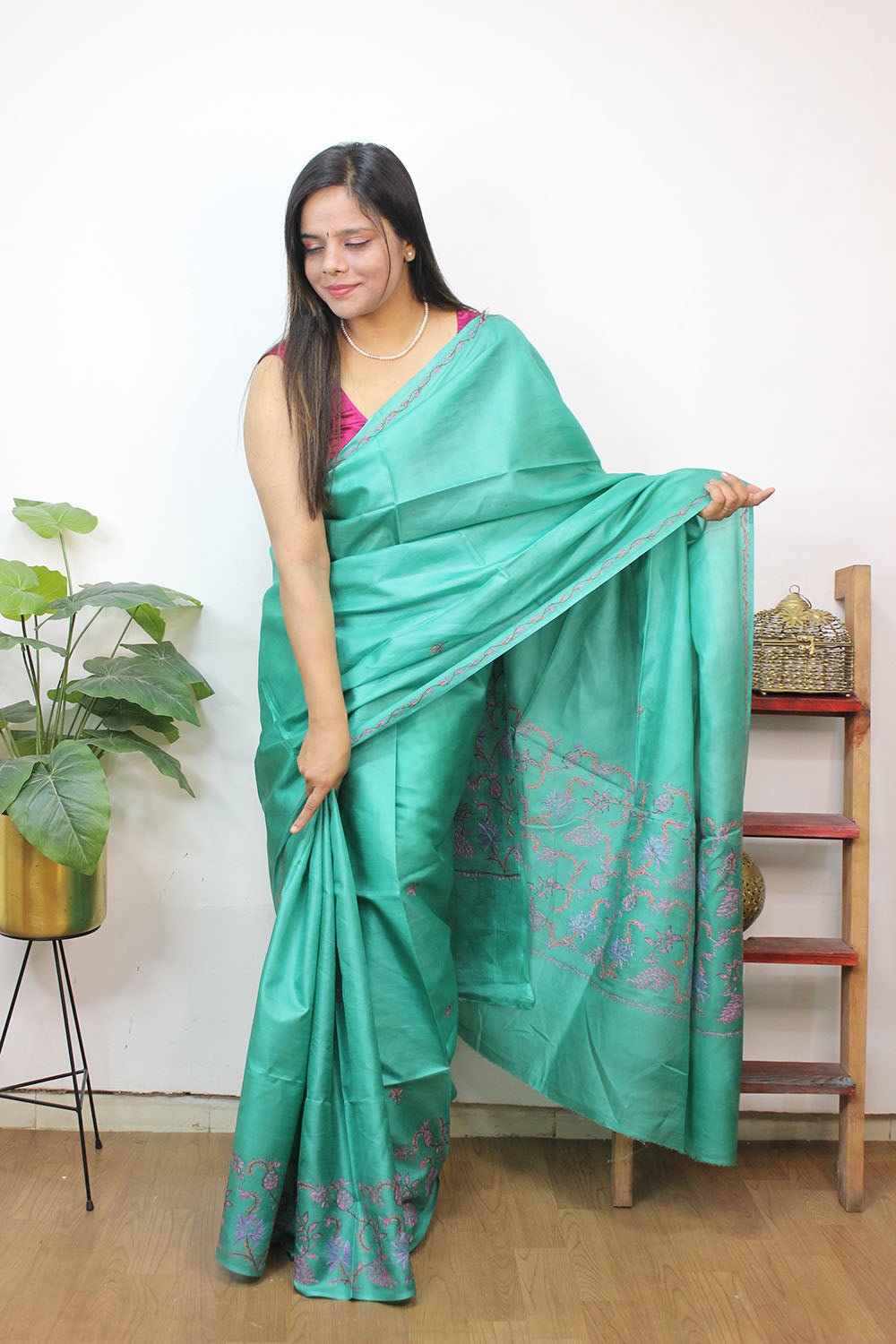 From our exclusive collection of Kashmiri Craftsmen, this is a Kashmiri Saree with Blouse which you would love to have it in your wardrobe. This Saree is a perfect occasion wear. Its an exclusive saree embroidered and a fresh collection directly from weavers in Kashmir. Sozni (or suzani) embroidery is a style of embroidery from the Jammu and Kashmir region. (It Comes With Contrast Blouse Piece).