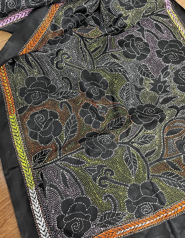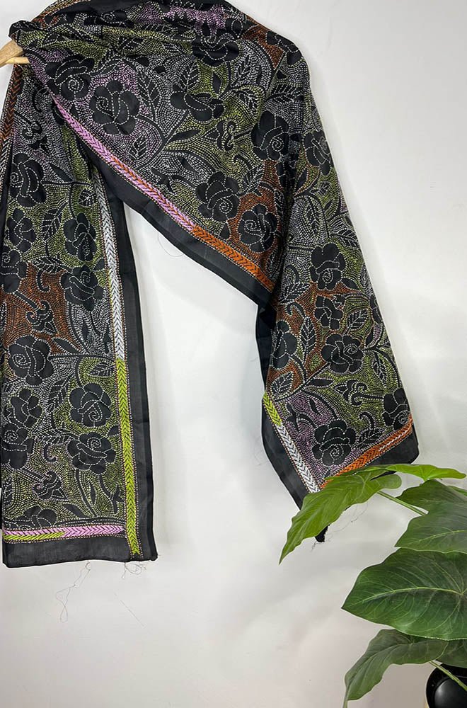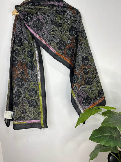 Black Hand Embroidered Reverse Kantha Pure Bangalore Silk Stole