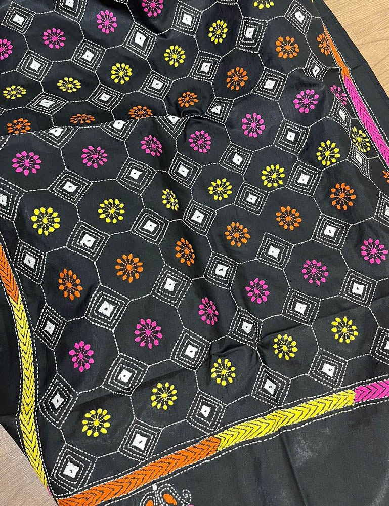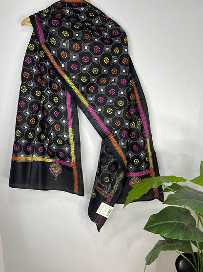 Black Hand Embroidered Kantha Pure Bangalore Silk Stole