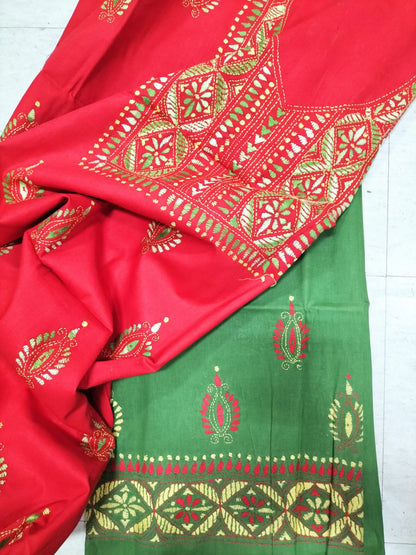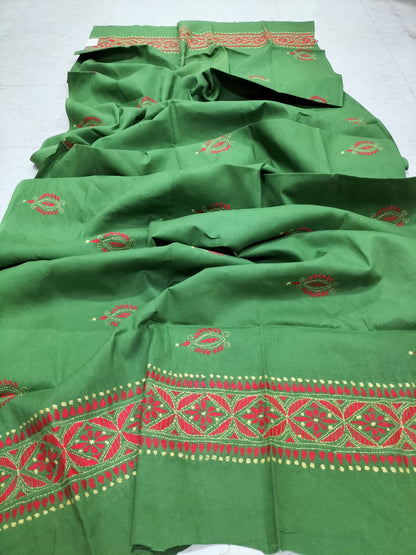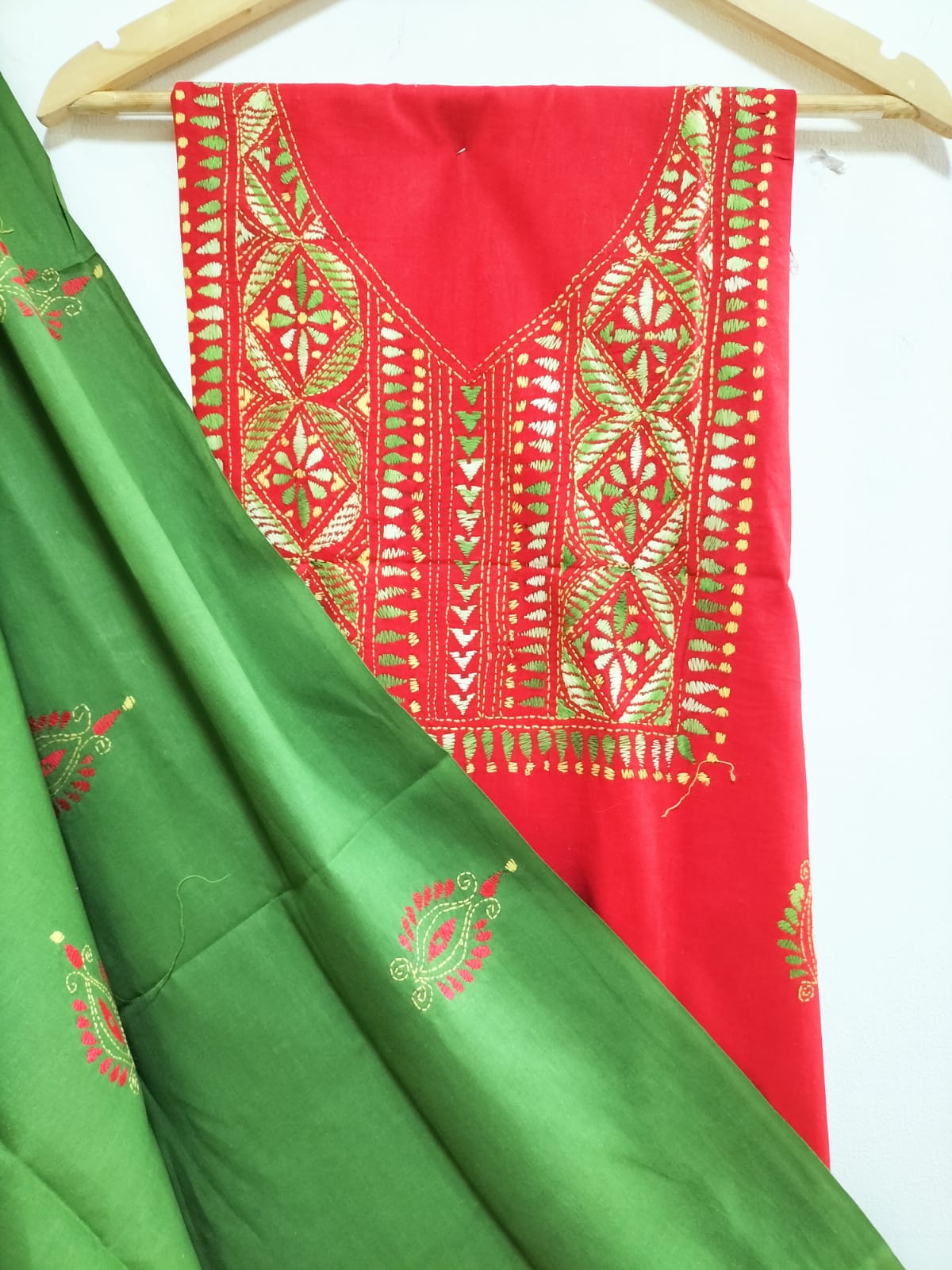 This Hand Embroidered Kantha Cotton Suit is a must have in your wardrobe which is a perfect occasion wear. Its an exclusive Suit. It comes with Top, Bottom and Dupatta Fabric.