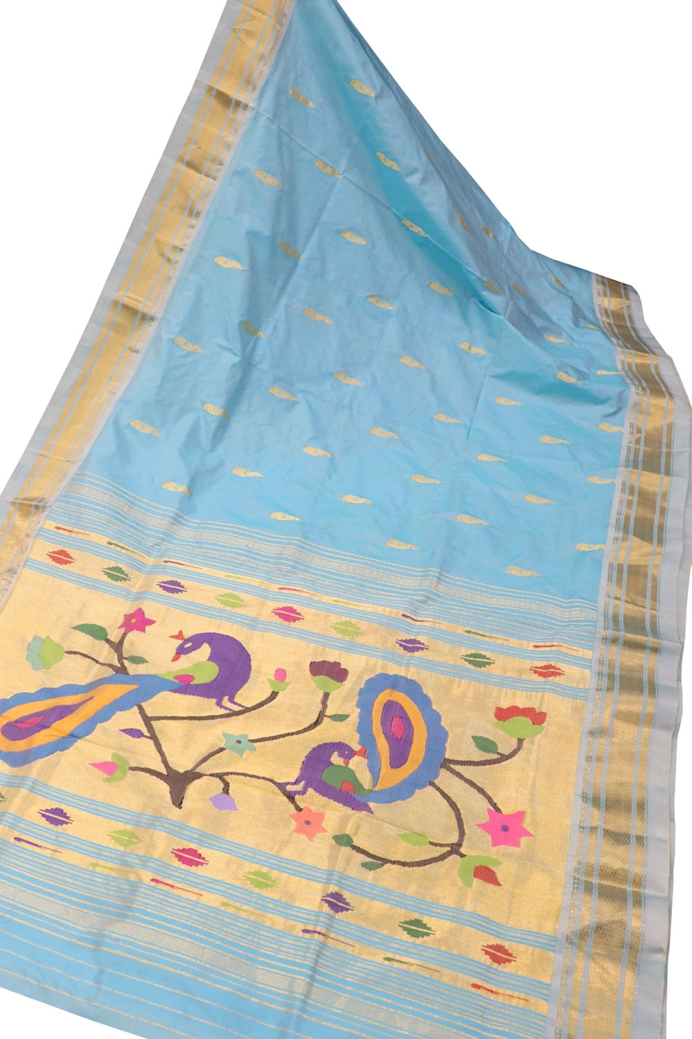 Blue Handloom Paithani Pure Silk Peacock And Flower Design Saree