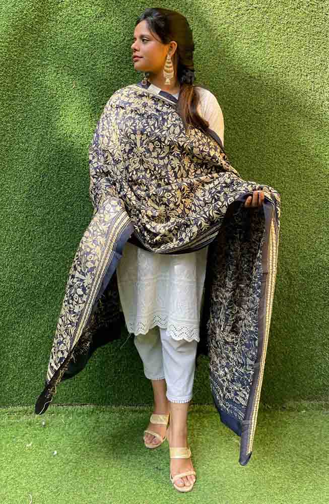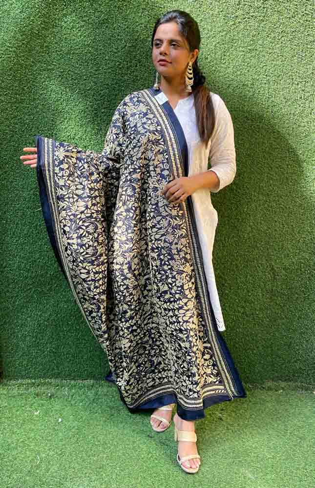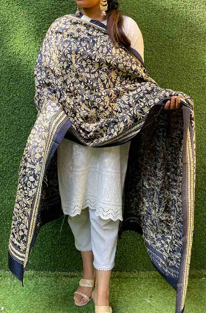 The Kantha Dupatta is a manifestation of creativity beyond imagination. Its an exclusive dupatta Hand Embroidered and a fresh collection directly from weavers in Bengal. The interesting thing in this embroidery is the entire cloth is covered with running stitches, and playing beautiful motifs, of flowers animals and birds. And geometrical shapes, as well as themes from everyday activities. The stitching on the cloth gives it a slight wrinkled wavy effect.
