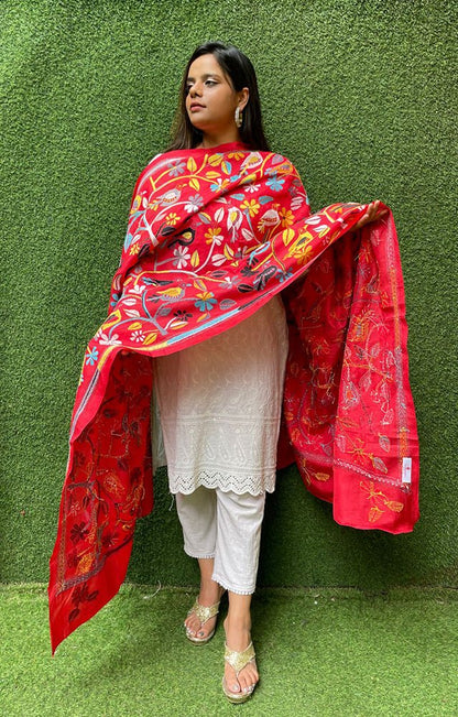 The Kantha Dupatta is a manifestation of creativity beyond imagination. Its an exclusive dupatta Hand Embroidered and a fresh collection directly from weavers in Bengal. The interesting thing in this embroidery is the entire cloth is covered with running stitches, and playing beautiful motifs, of flowers animals and birds. And geometrical shapes, as well as themes from everyday activities. The stitching on the cloth gives it a slight wrinkled wavy effect.