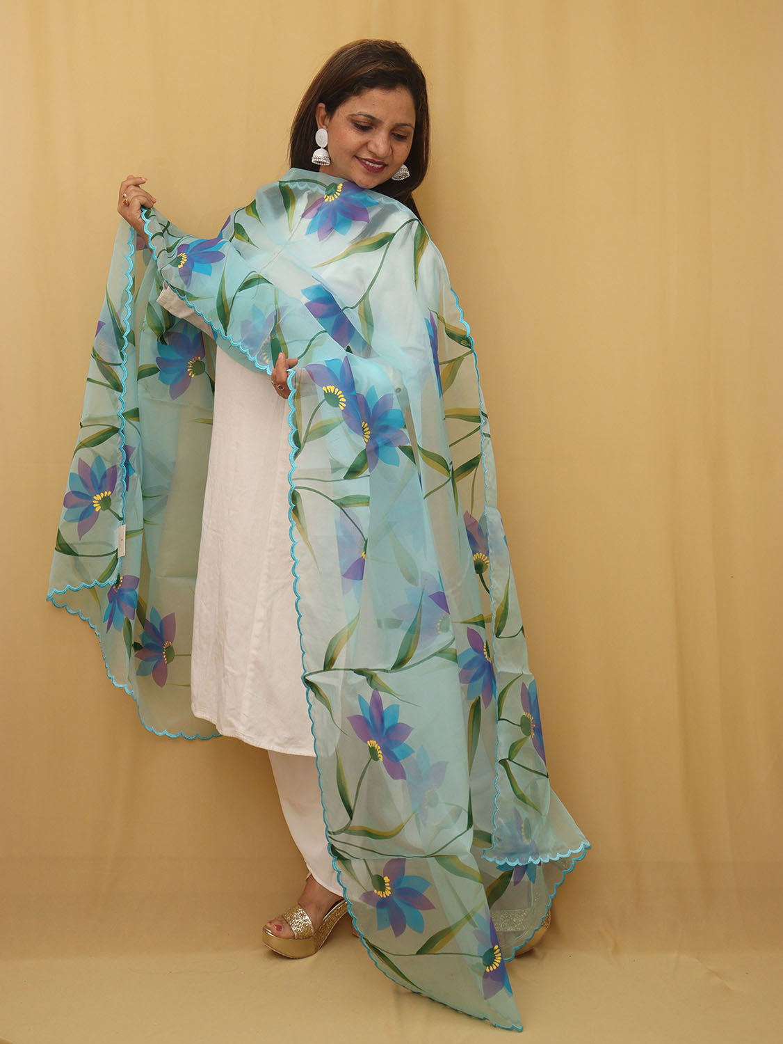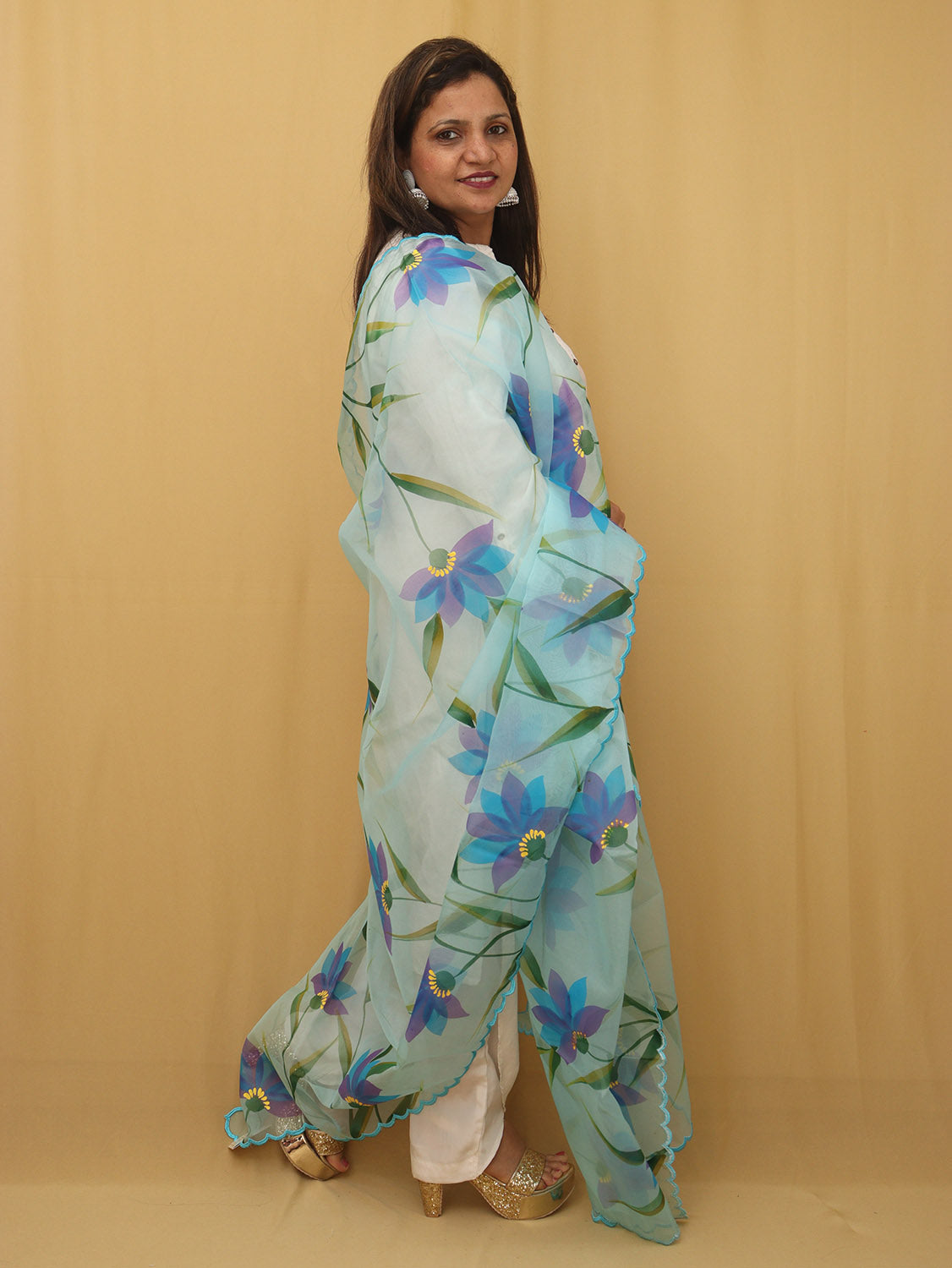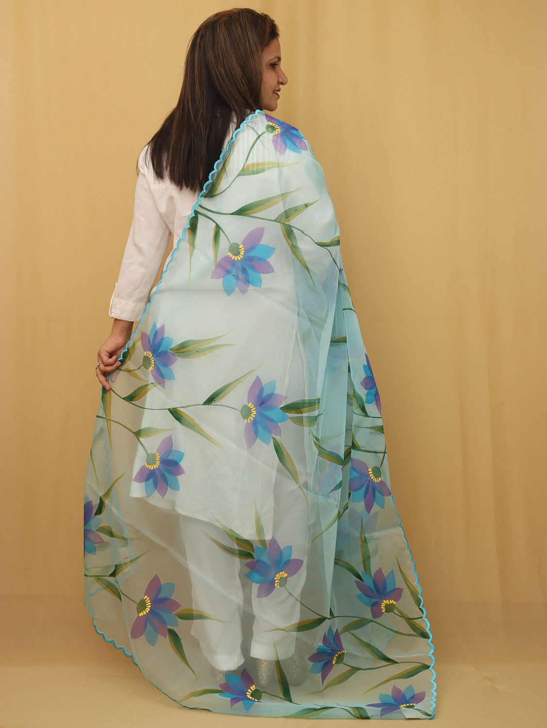 This is a Hand Painted Organza Dupatta, it is individually crafted to give a gorgeous look to Indian personality. This is a simple yet elegant looking dupatta (Length = 2.5 Mtrs).