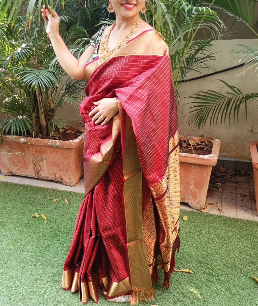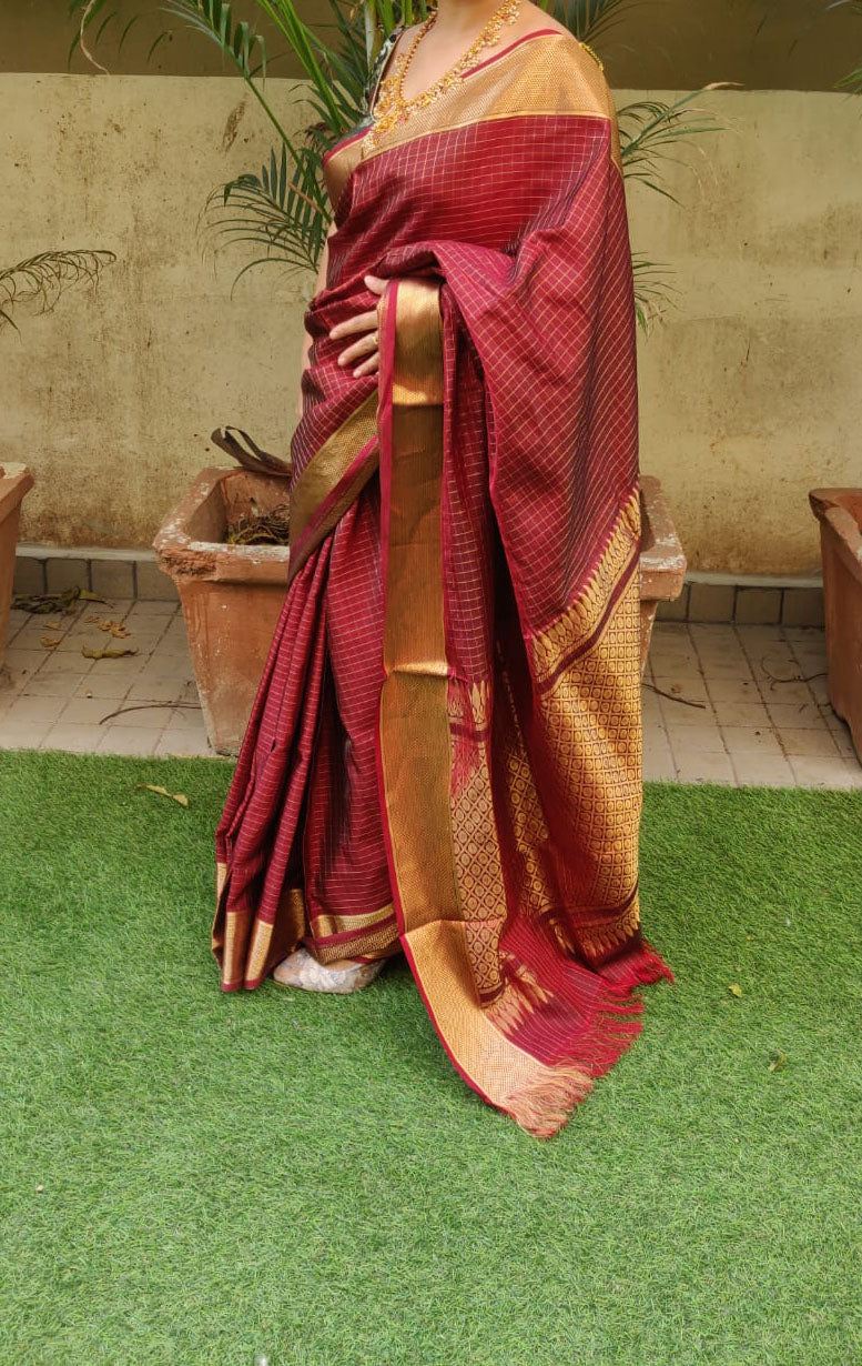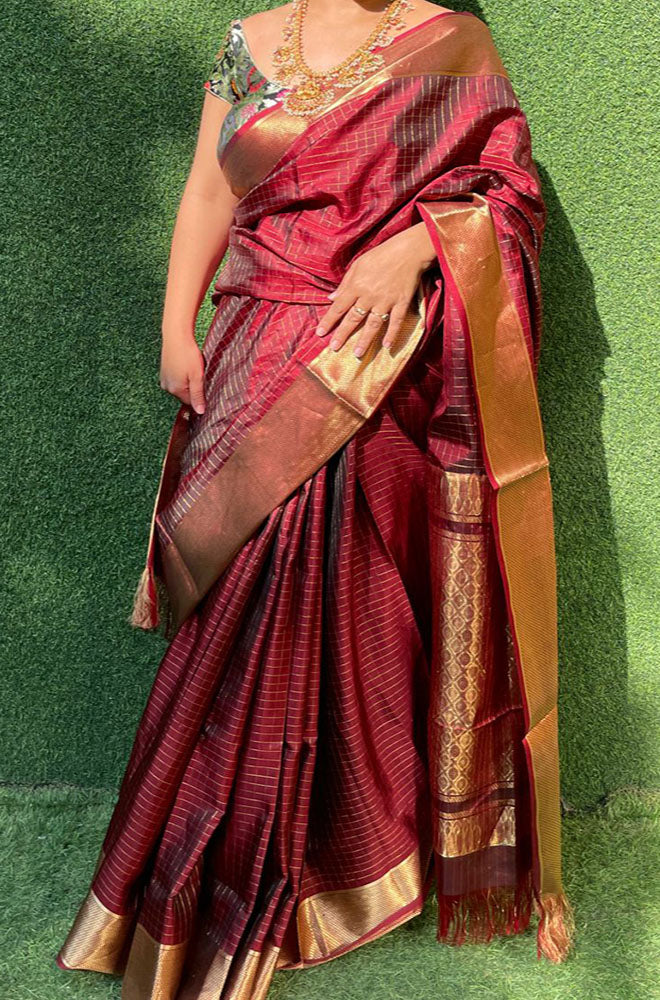 "This is a Handloom Kanjeevaram Pure Silk Saree, which you would love to have it in your wardrobe. This Saree is a perfect occasion wear. Its an exclusive saree Handloom weaved and a fresh collection directly from weavers. Kanjeevaram Sarees are wovened by pure mulberry silk.