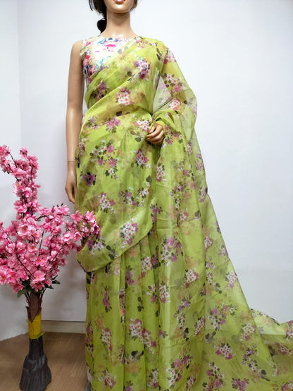 This Green Digital Printed Organza Silk Floral Design saree to be paired it with a contrast color blouse giving a completely new and trendy look. A saree is all times women favourite and a classic attire. Flaunt yourself with the latest trendy saree. You can pair it up with a belt to give a new look.