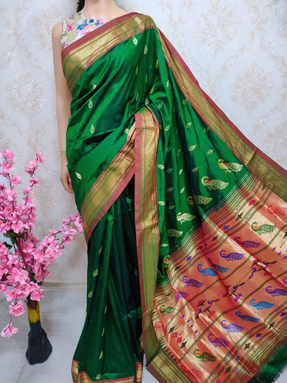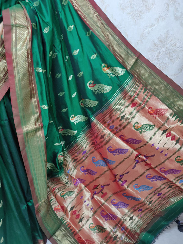 This is a Paithani Pure Silk Saree, which you would love to have it in your wardrobe. This Saree is a perfect occasion wear. Its an exclusive Handloom weaved saree made of Pure Silk and zari . This saree is the result of a painstakingly complex process of weaving & dyeing. (This saree wiil be made on order basis)