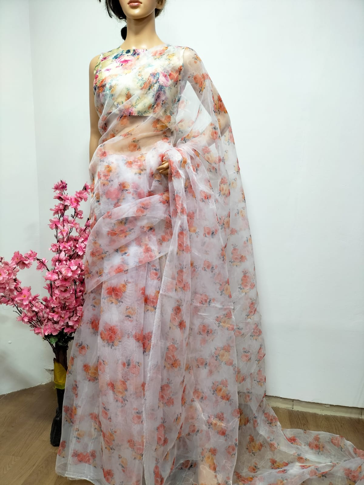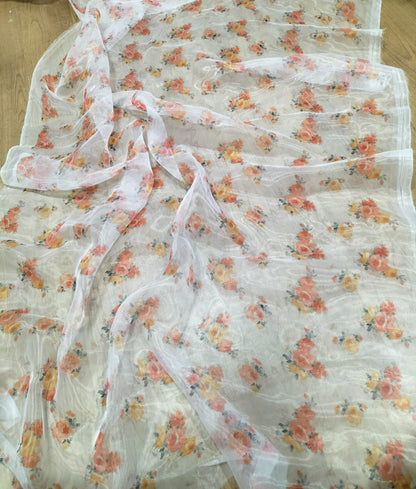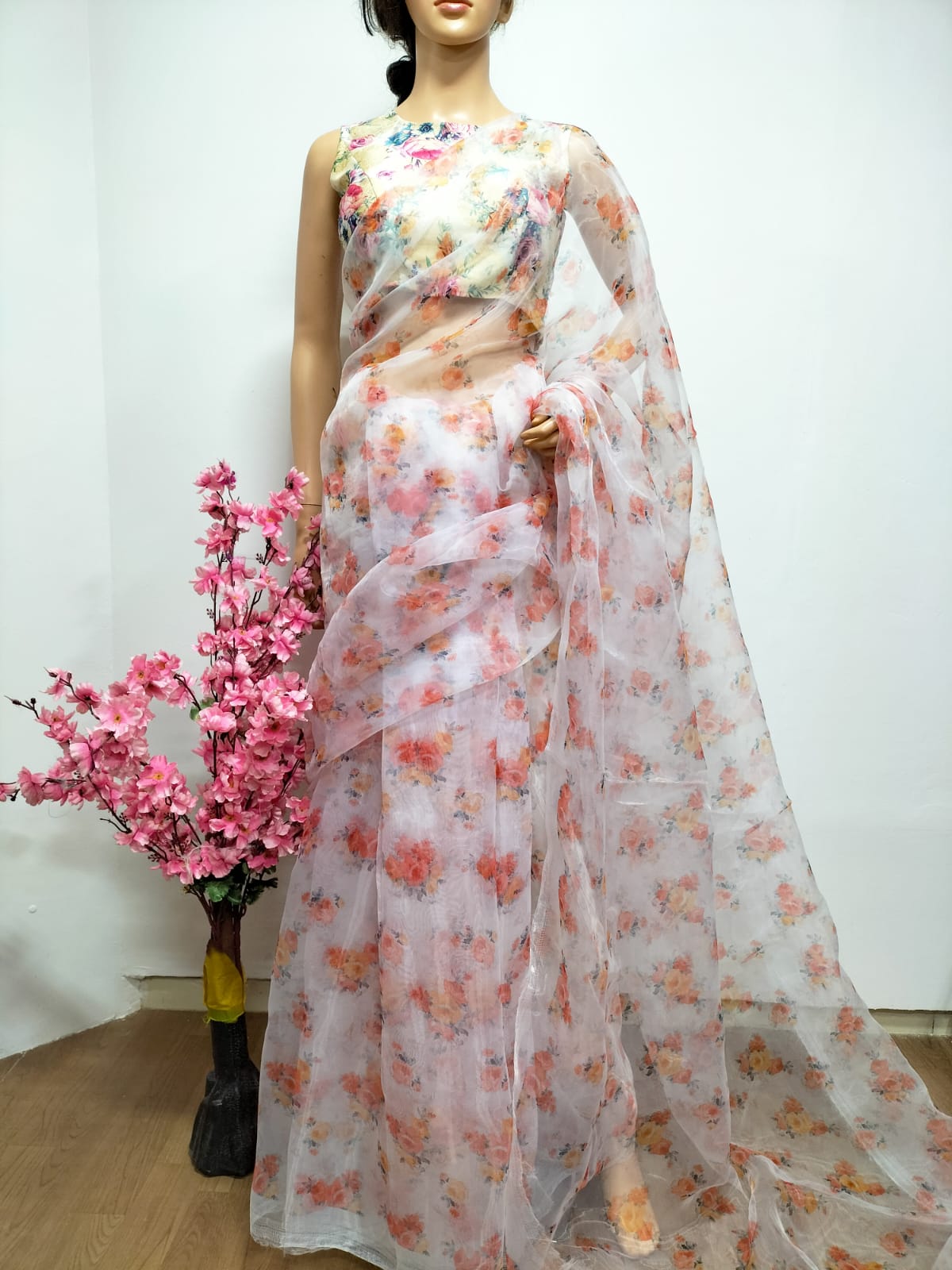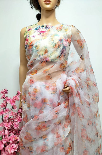 This Off White Digital Printed Organza Silk Floral Design saree to be paired it with a contrast color blouse giving a completely new and trendy look. A saree is all times women favourite and a classic attire. Flaunt yourself with the latest trendy saree. You can pair it up with a belt to give a new look.