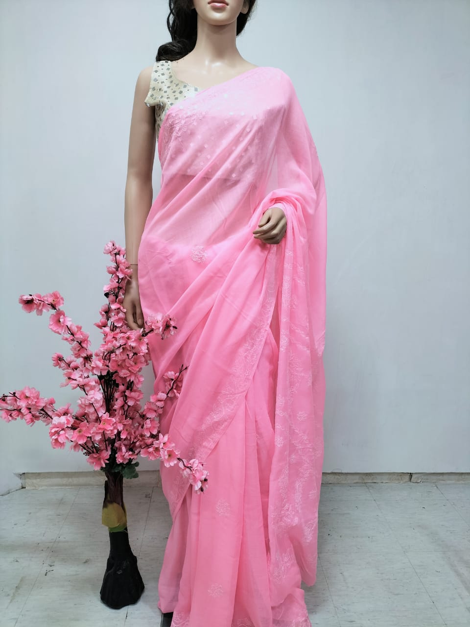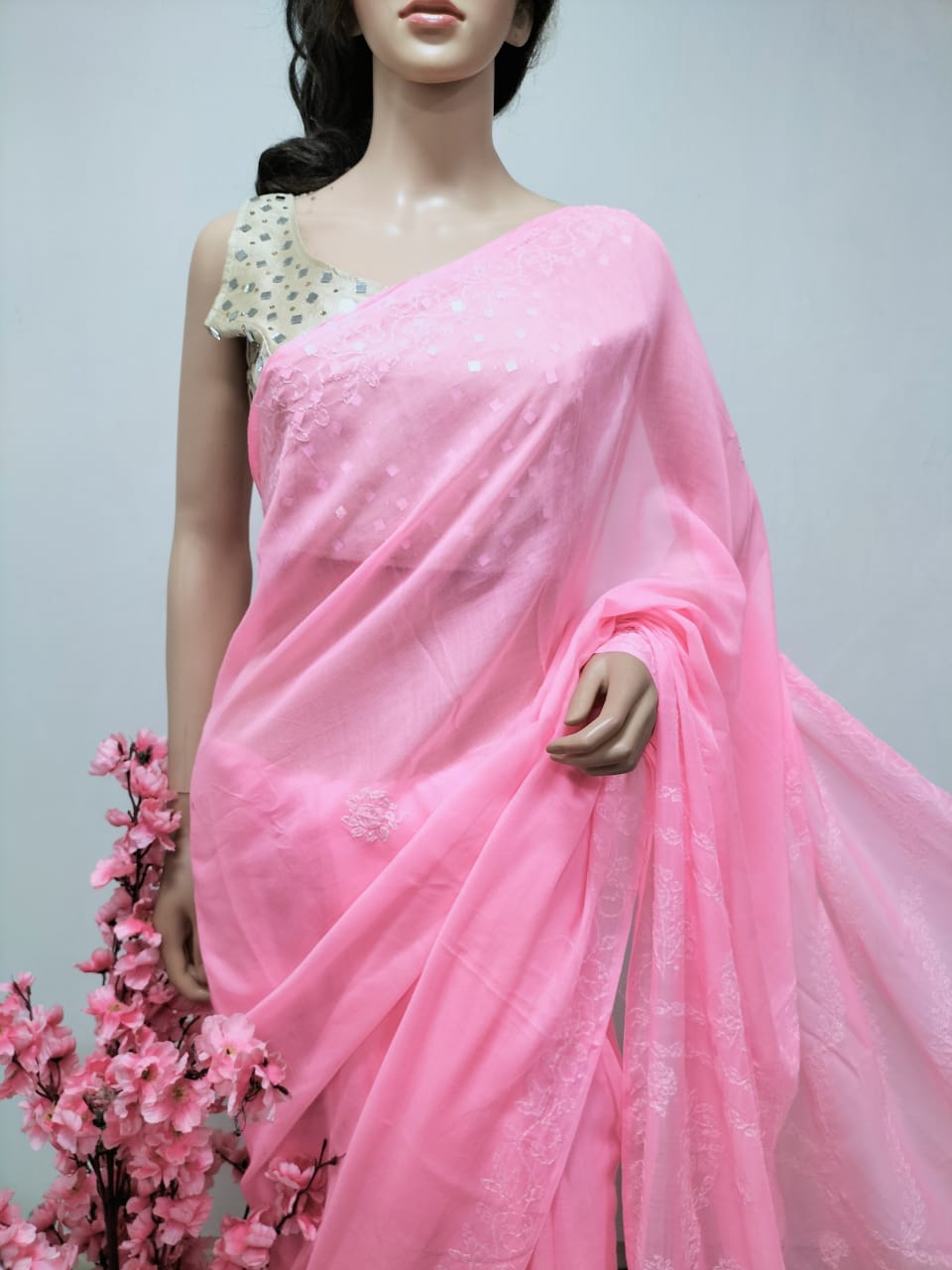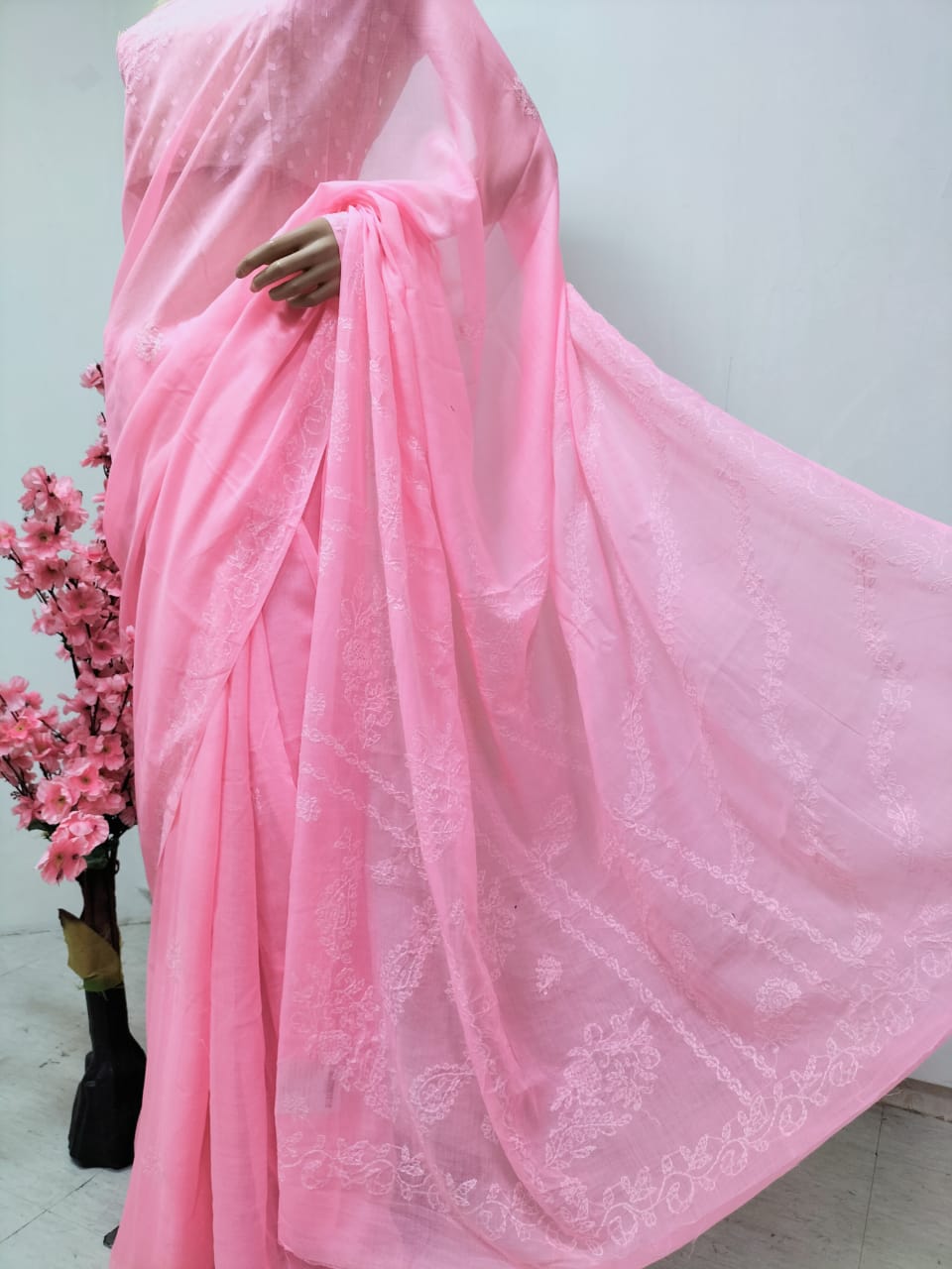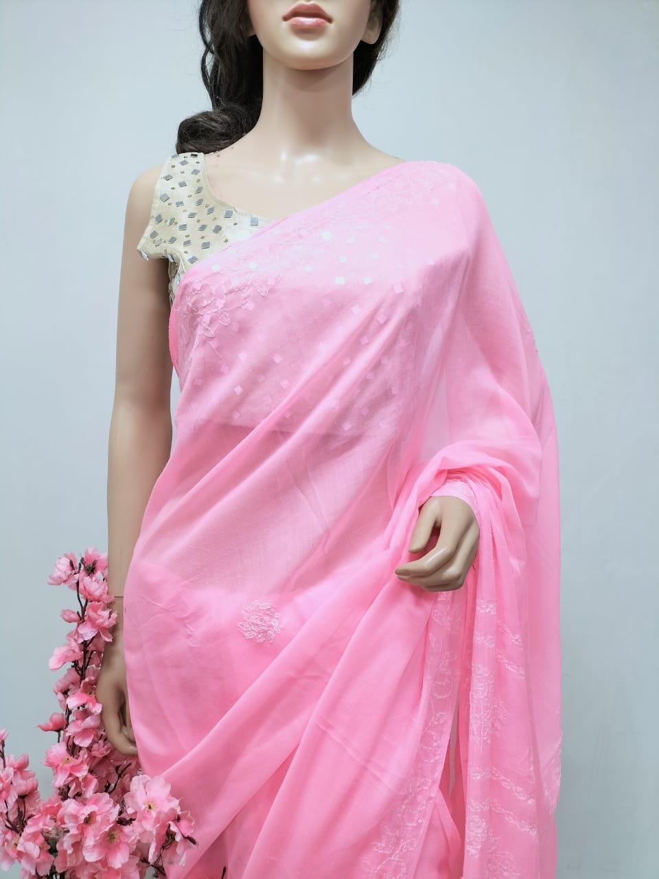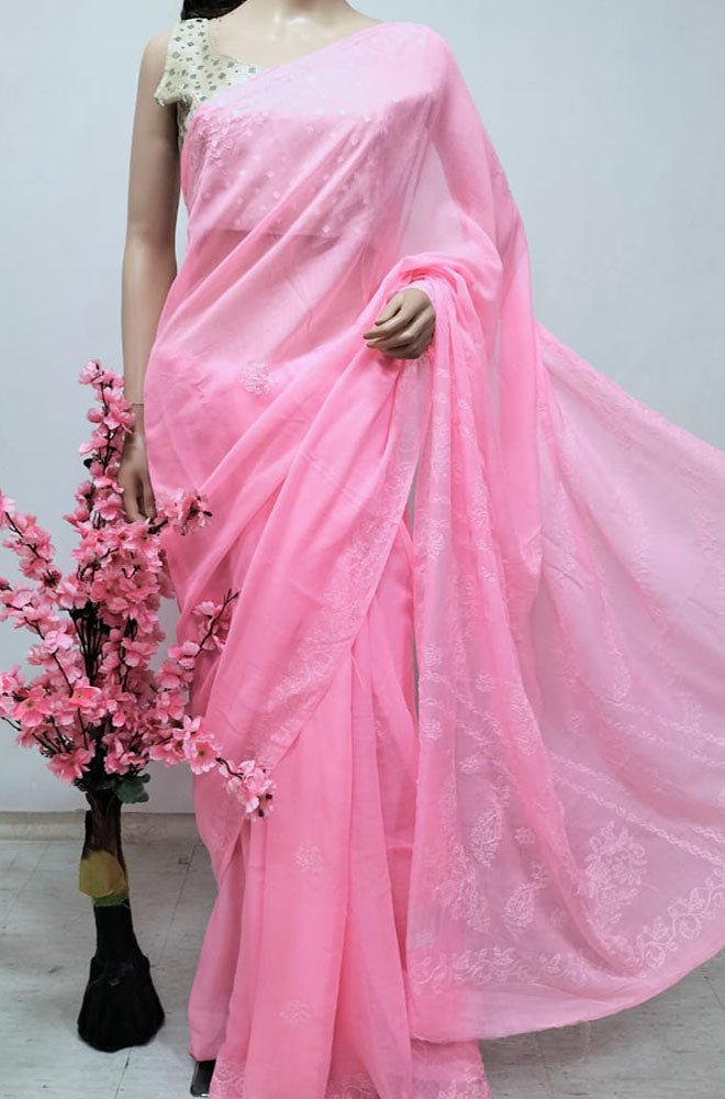 This is a Pink Embroidered Chikankari Pure Cotton Saree with Green Pure Silk Hand Painted Blouse.