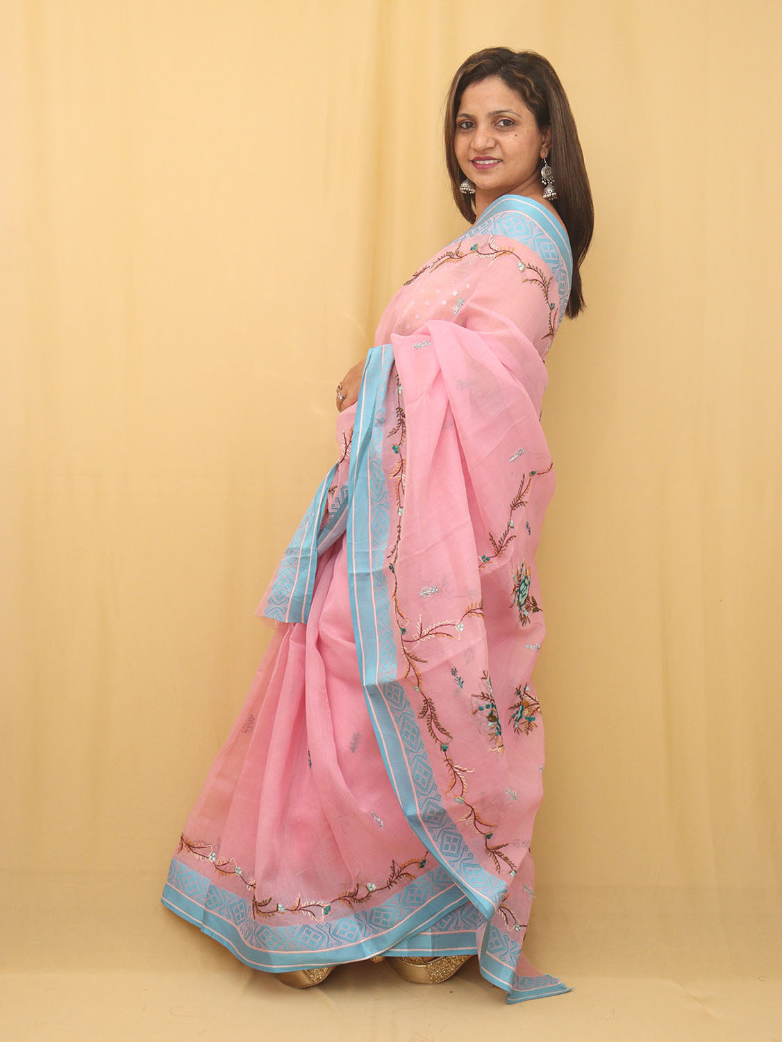 This pink linen organza saree looks gorgeous when one wears this saree. It has a very beautiful embroidery and it is ideal wear in evening.