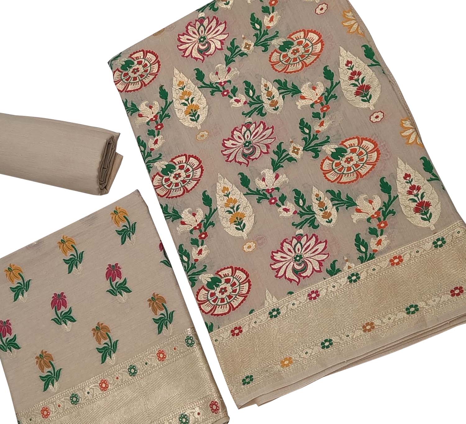 Elevate your ethnic wardrobe with this exquisite Banarasi Pure Moonga Silk three-piece suit set, featuring intricate Meenakari embellishments that showcase traditional craftsmanship. The unstitched design offers complete customization freedom, allowing you to tailor the fit and silhouette to your preferences. Crafted from luxurious pure Moonga silk, this fabric drapes beautifully while maintaining its lustrous sheen. The dyeable nature of the material enables you to create a personalized color palette that complements your skin tone and style sensibilities. Perfect for weddings, festivals, and special occasions, this timeless piece combines heritage artistry with contemporary versatility.
